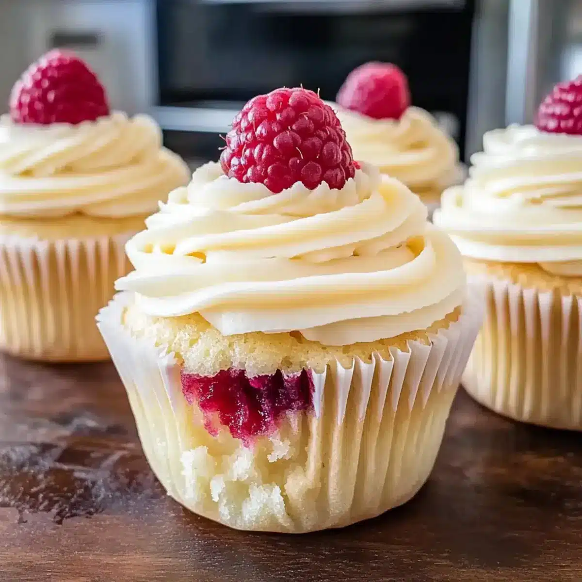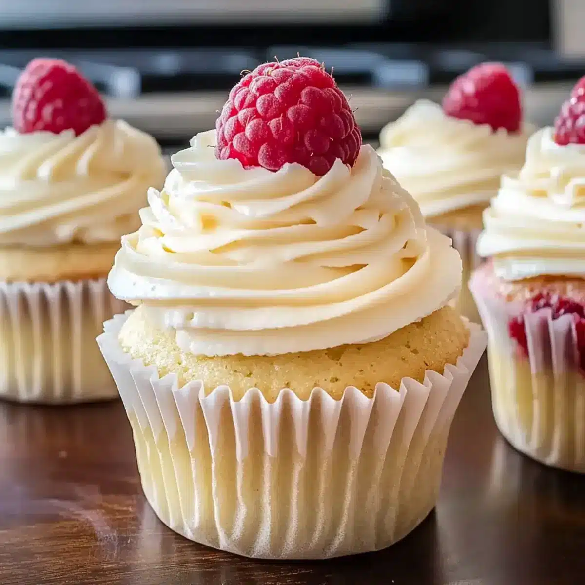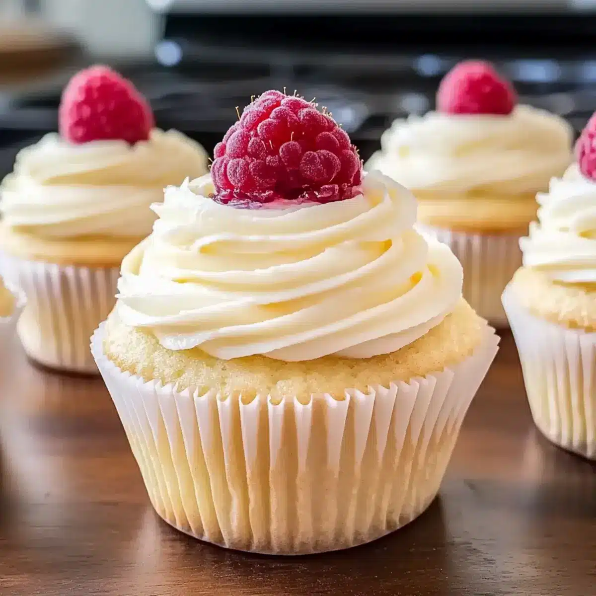 - Top each filled cupcake with buttercream frosting and garnish with fresh raspberries if desired.