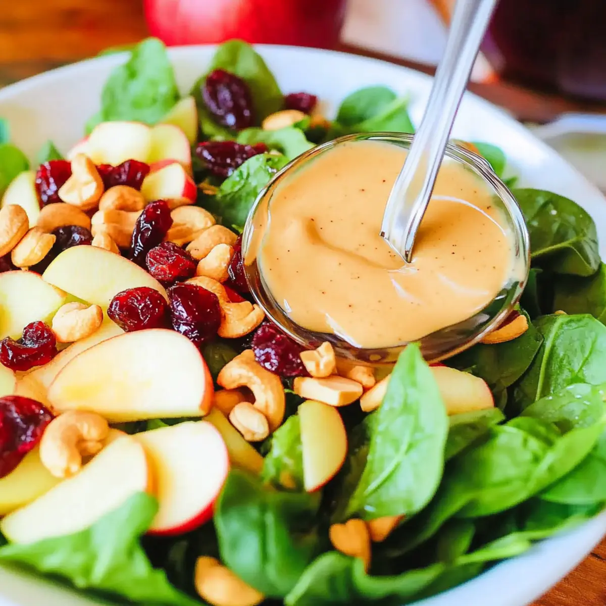 Vibrant Ingredients: Fresh baby spinach, juicy apples, and chewy cranberries create a colorful, eye-catching dish that’s perfect for any table.