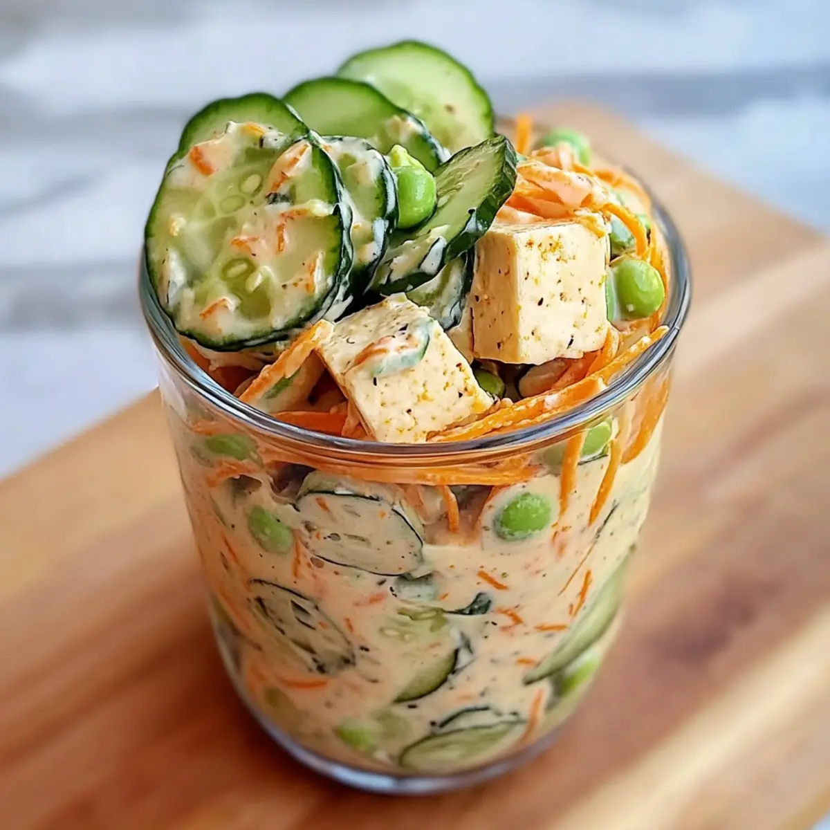 Start by washing and thinly slicing the cucumbers into bite-sized pieces. Gather your other ingredients: chop the spring onions, julienne the carrots, and cube the tofu. In a large glass jar, layer the cucumbers first, followed by spring onions, tofu, edamame, and carrots, gently pressing down each layer to compact the ingredients.