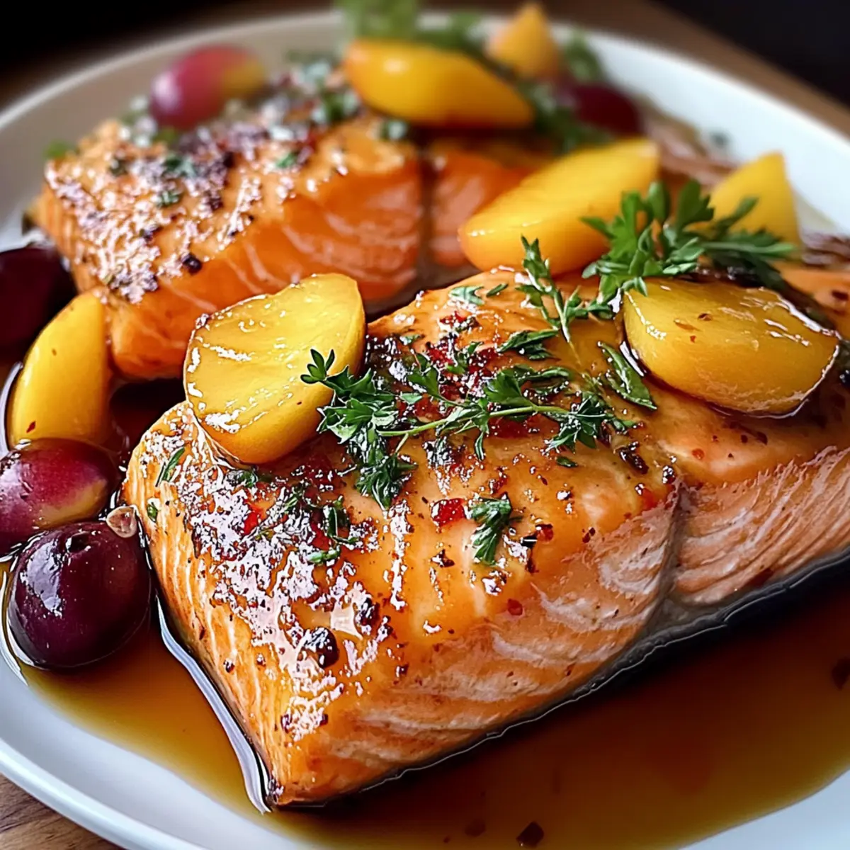 Unforgettable Flavors: Each bite of Bourbon Peach Roasted Salmon is a delightful fusion of sweet peaches and savory bourbon, offering a unique flavor experience that’s sure to impress.