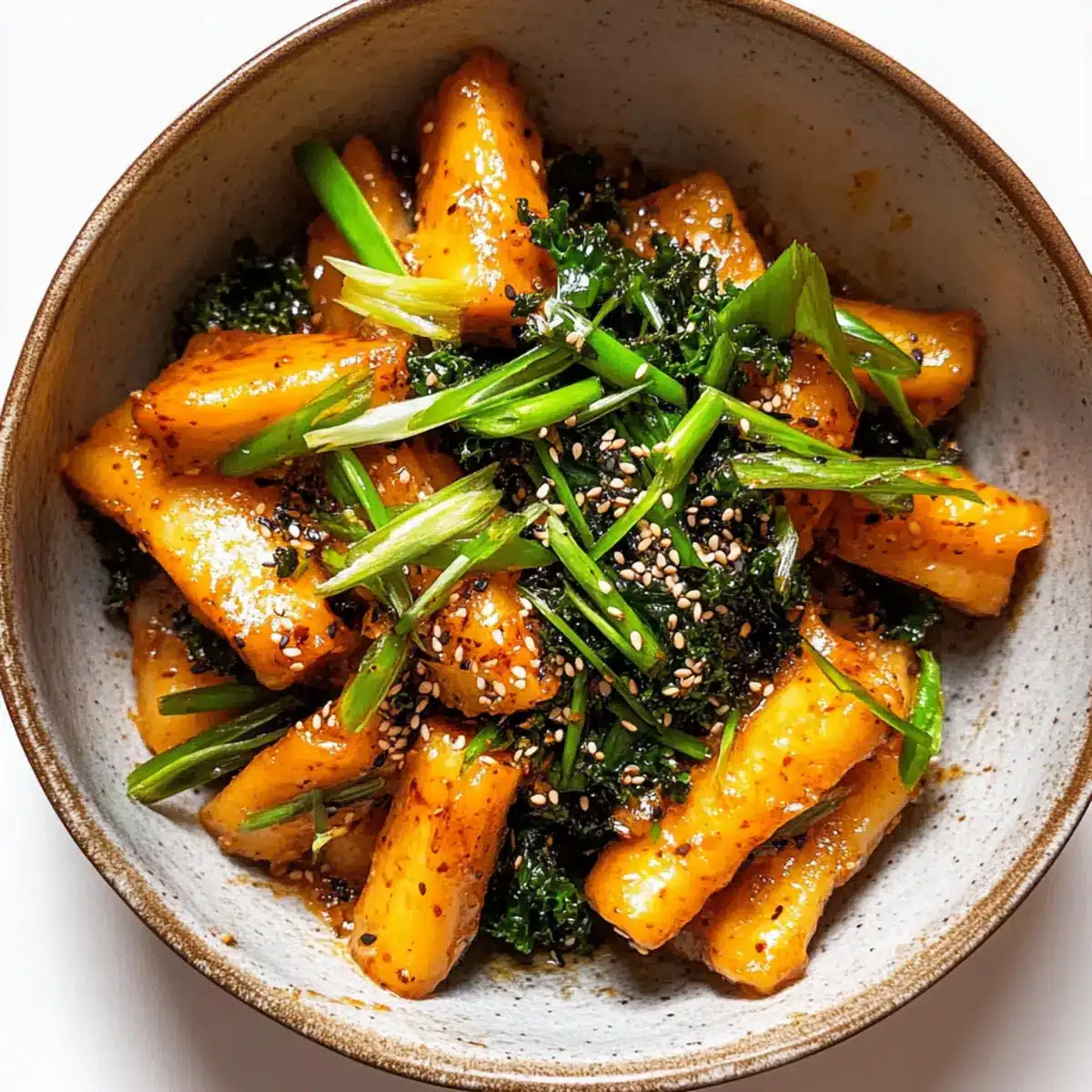 8. Serve the Brown Butter Tteokbokki warm, garnished with scallions and white sesame seeds.