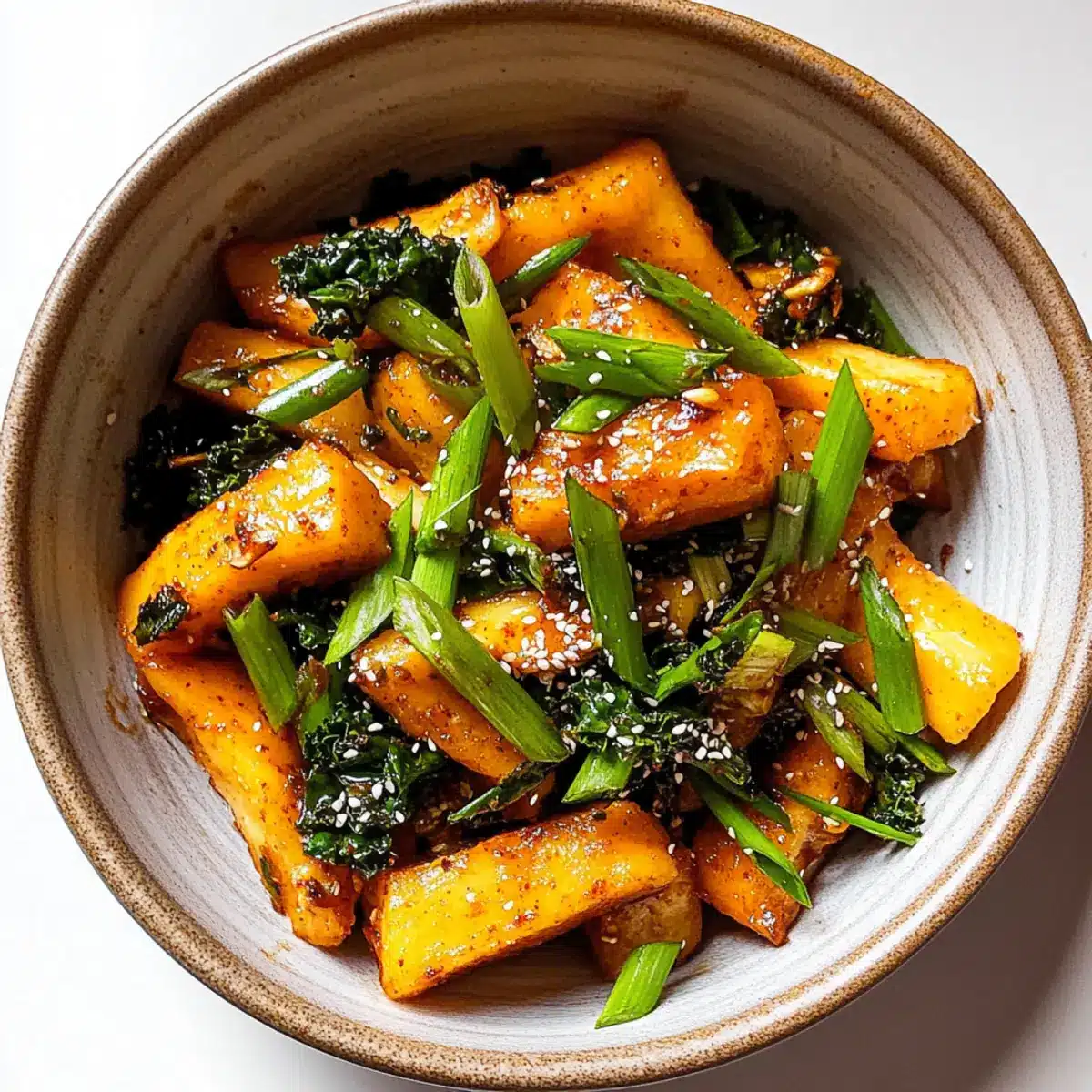 Once the sauce reaches the desired thickness, lower the heat, and stir in the shredded kale until it wilts, about 1-2 minutes. Next, gently fold in the seared tofu, mixing until every bite of the Brown Butter Tteokbokki is coated in that savory sauce. This brings a lovely color and nutrition to the dish.