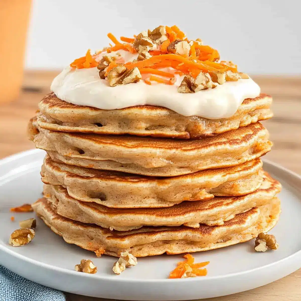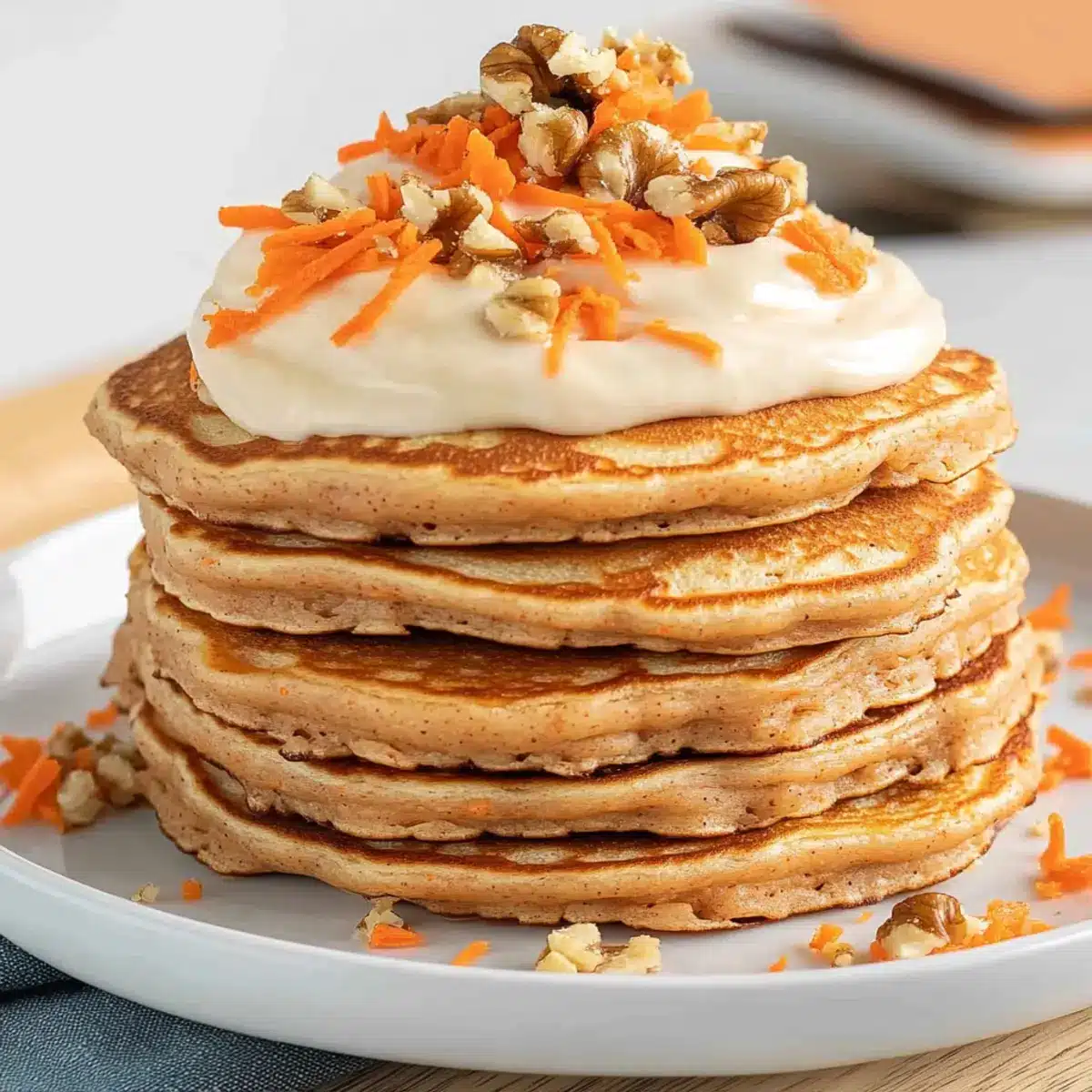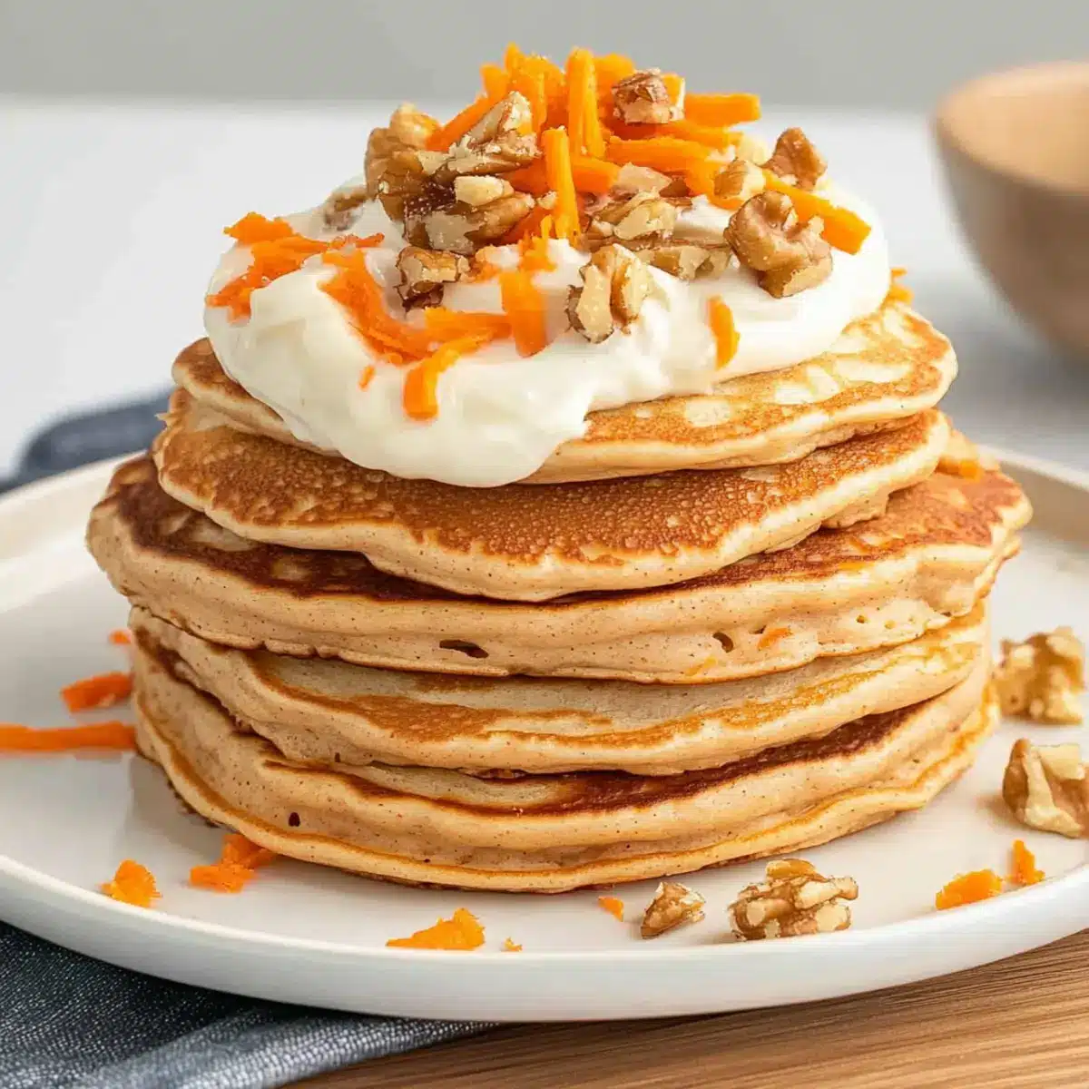 Stack your fluffy Carrot Cake Pancakes on a warm plate and generously top them with the cream cheese frosting. For an extra touch, sprinkle more chopped walnuts on top and drizzle with maple syrup if desired. These delightful pancakes turn an ordinary breakfast into a deliciously sweet celebration!