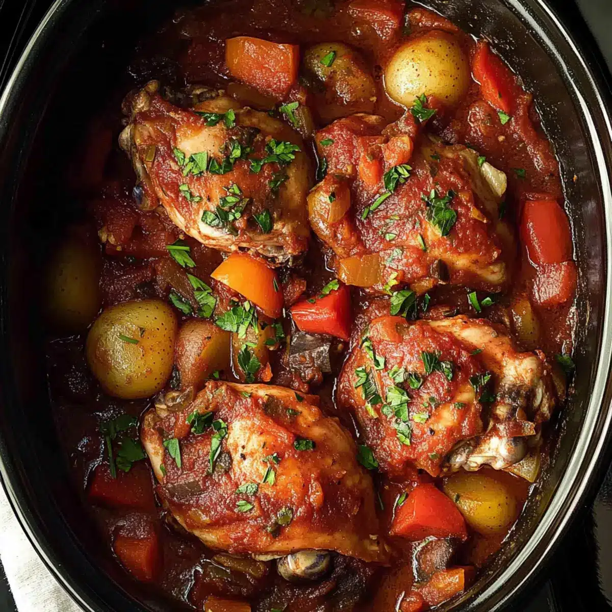 This Chicken Cacciatore Slow Cooker recipe combines fall-off-the-bone chicken thighs with tender potatoes in a rich tomato sauce, perfect for a busy weeknight.