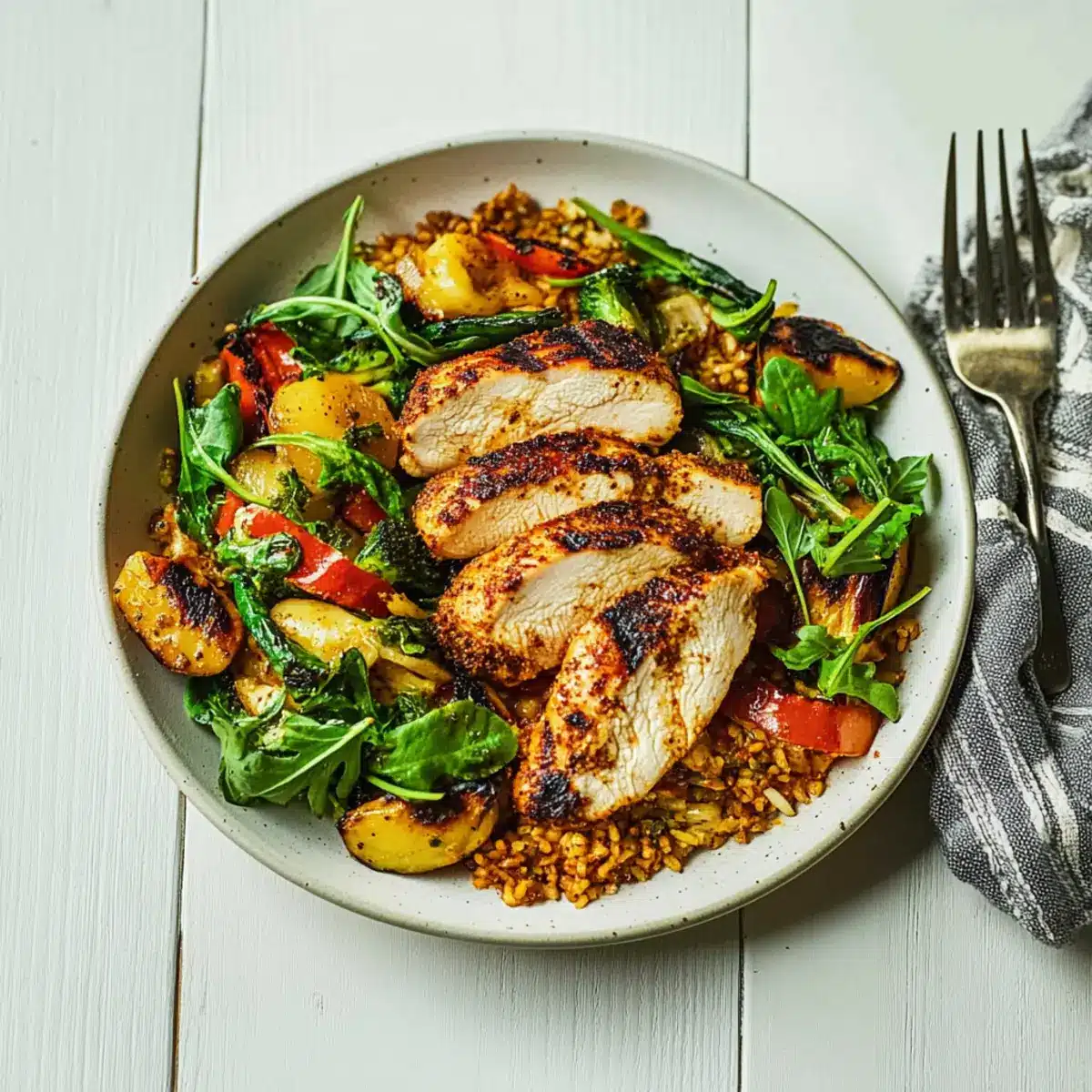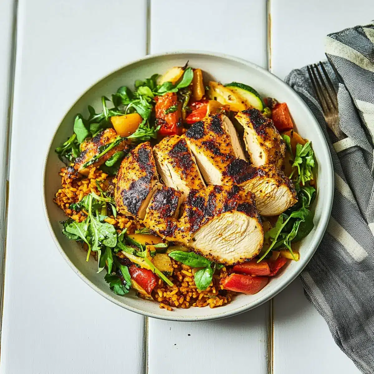 Once the chicken is cooked, remove it from the oven and let it rest for a couple of minutes. On a plate, layer the fluffy couscous, sautéed vegetables, and sliced chicken. Drizzle with fresh lemon juice and sprinkle cumin for an additional flavor kick, completing your Chicken Couscous Bowl.