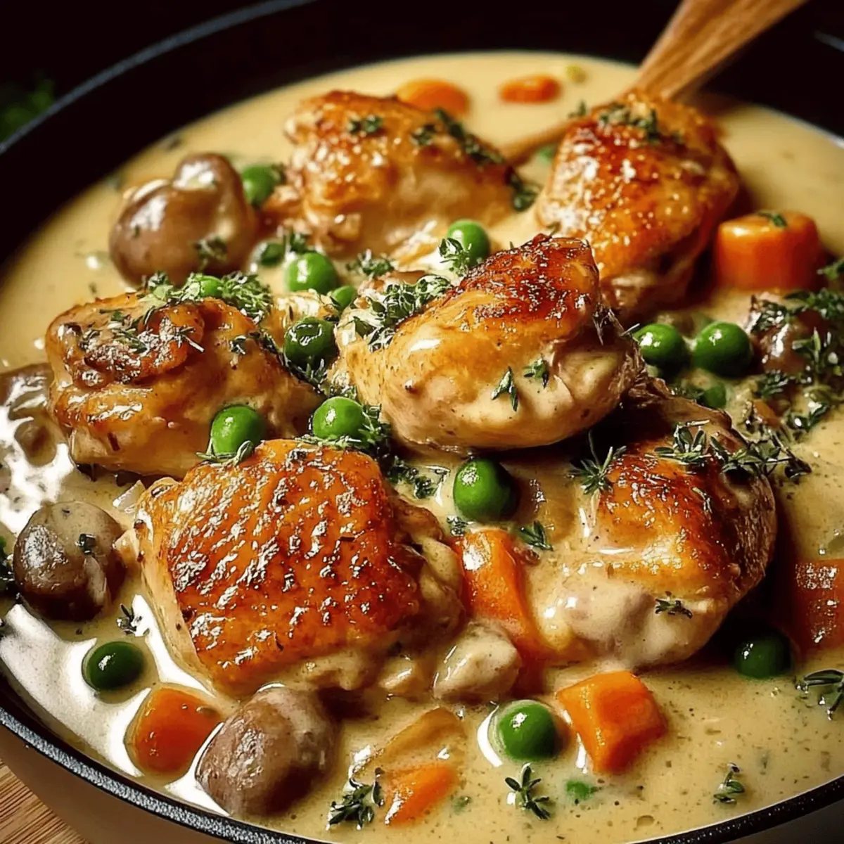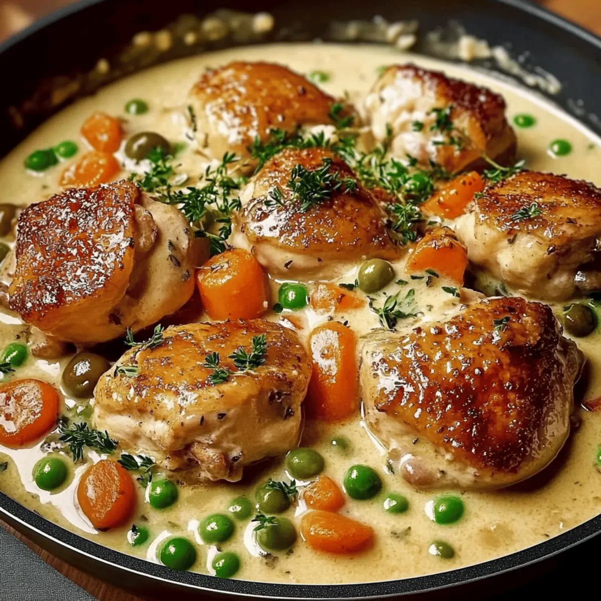 Comforting, creamy goodness: This Chicken Fricassee offers a rich, velvety sauce that embraces tender chicken and fresh vegetables, making each bite pure bliss.