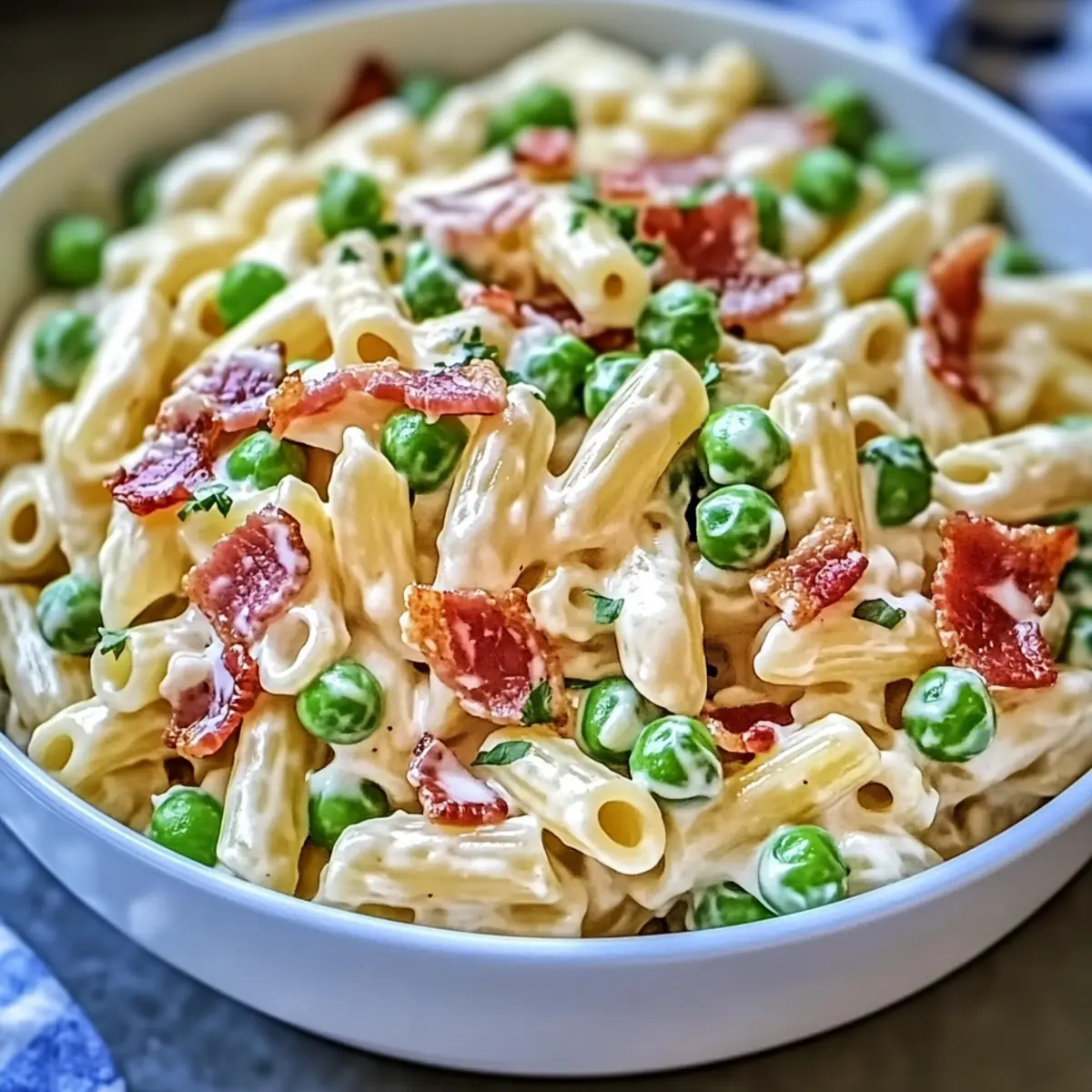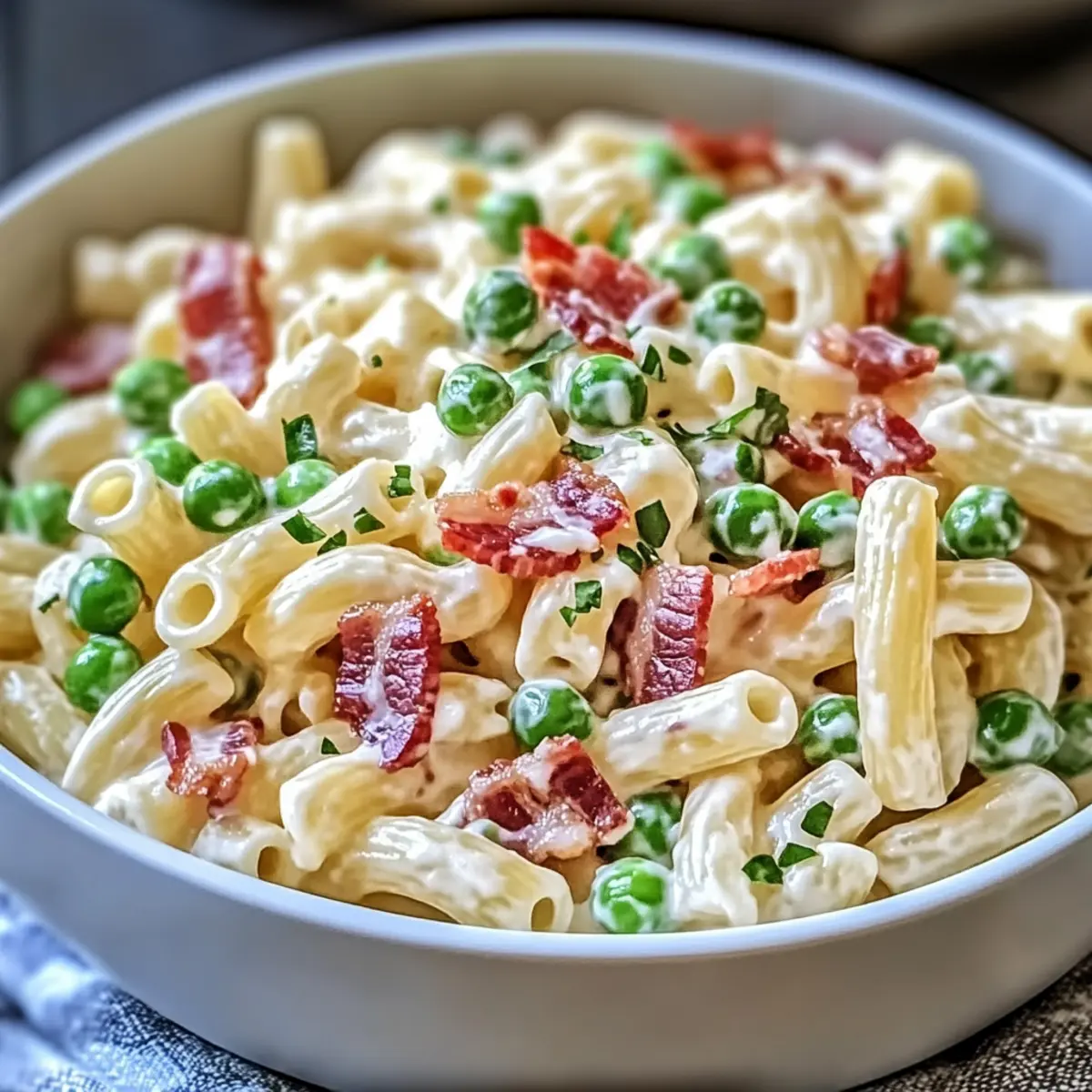This Creamy Pasta Salad is a versatile dish perfect for gatherings, featuring smoky bacon and sweet peas in a rich dressing.