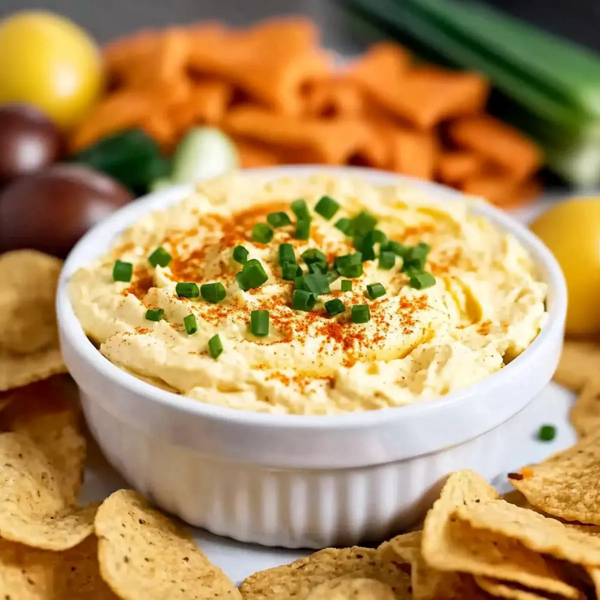 Transfer your creamy deviled eggs dip into a serving bowl for presentation. To finish, sprinkle the top with paprika for a burst of color or cayenne pepper if you like it spicy. Garnish with a few extra chopped chives for a pop of freshness. Serve immediately with chips, crackers, or crunchy veggies for a delicious and satisfying appetizer that’s sure to be a hit at your gathering.