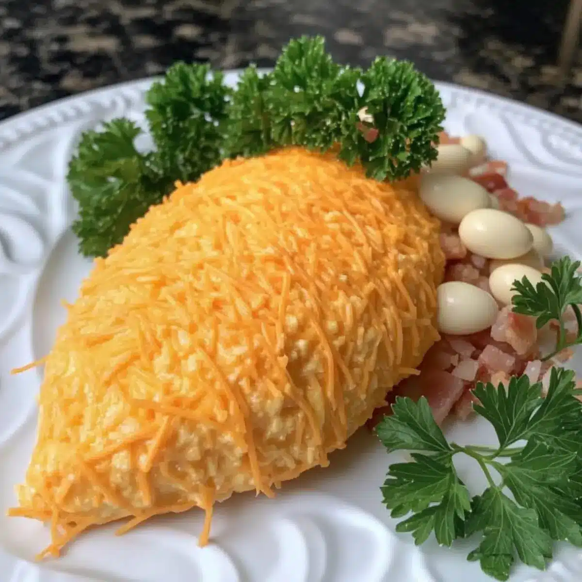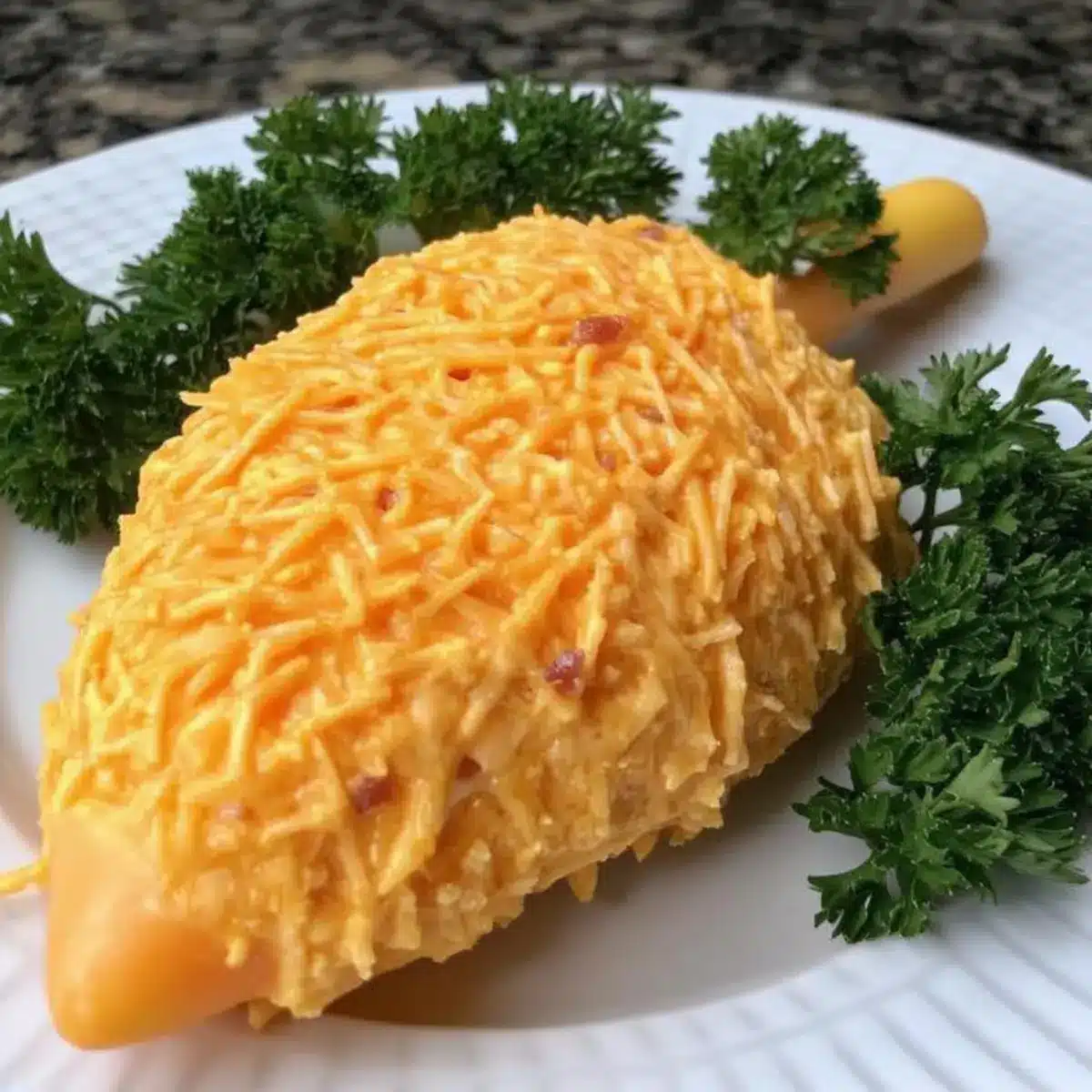 To finish, take your carrot-shaped cheese ball and garnish the top with fresh parsley, which mimics the green leaves of a carrot. Use a bit of culinary creativity by arranging the parsley to resemble the vibrant tops of real carrots. This final touch enhances the presentation of your Easter Cheese Ball before serving.
