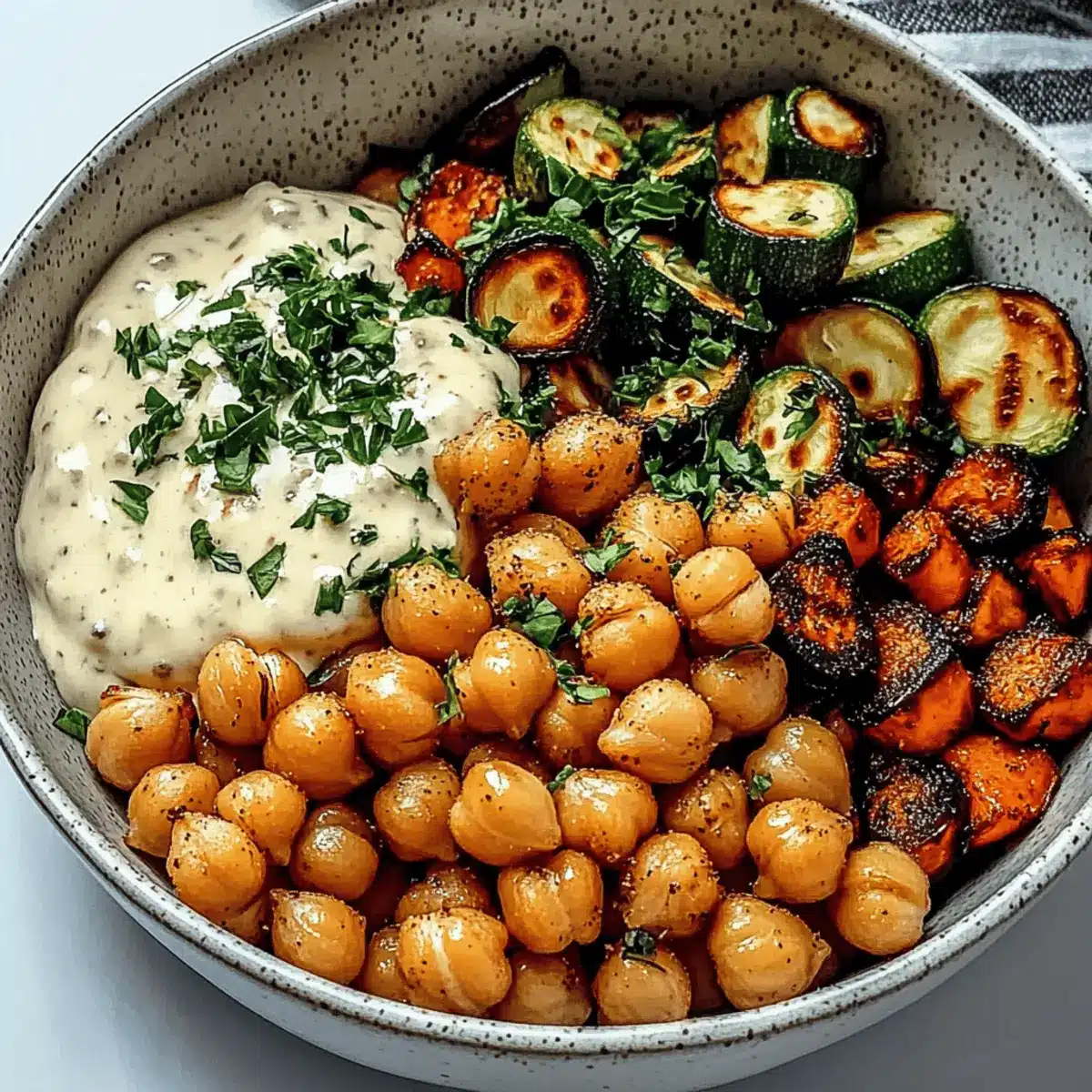 Absolutely! To freeze, allow the roasted mixture to cool completely. Then, transfer it to a sealed freezer bag, removing as much air as possible. Your Flavorful Roasted Chickpea and Veggie Bowl can last in the freezer for up to 3 months. When you’re ready to eat, simply thaw overnight in the fridge before reheating in the oven for about 10-15 minutes at 350°F (175°C) for that perfect crunch.