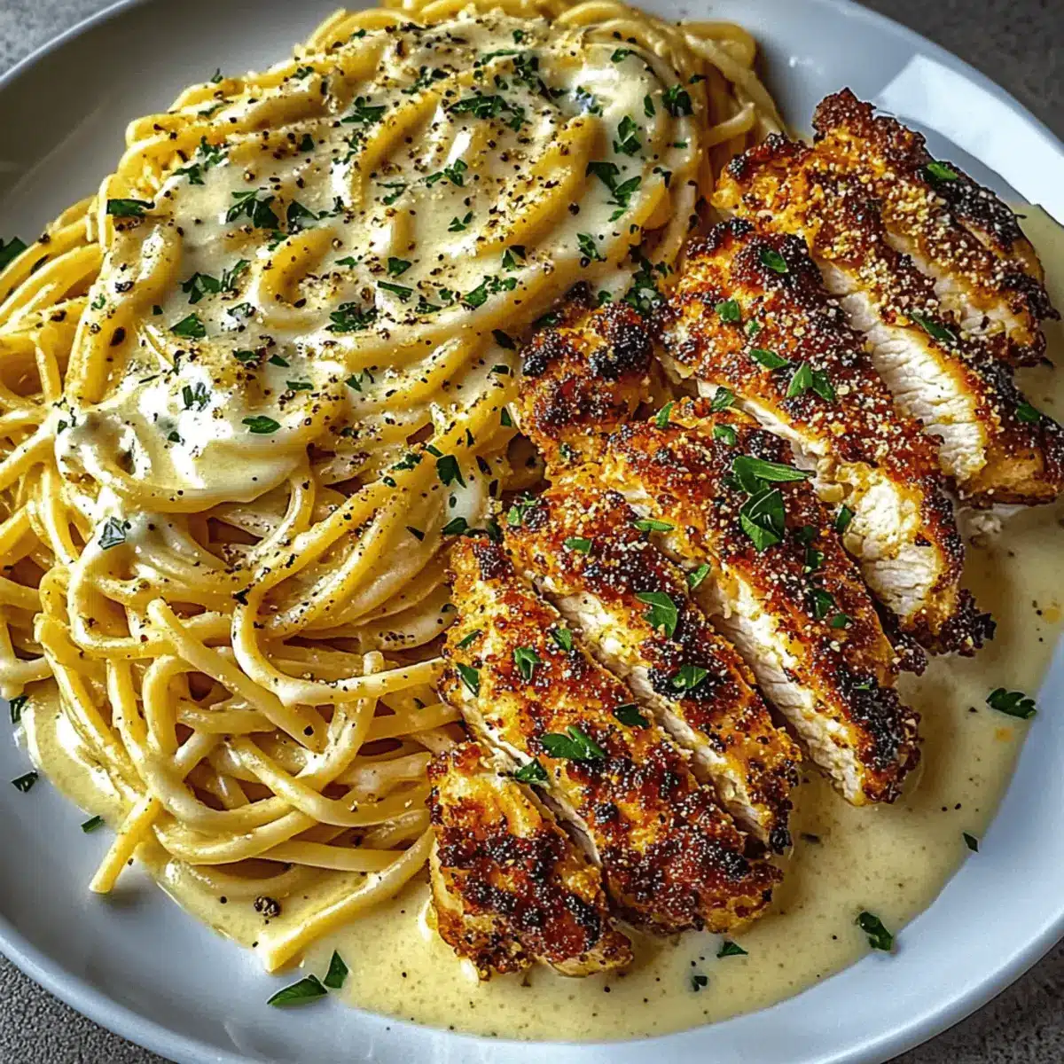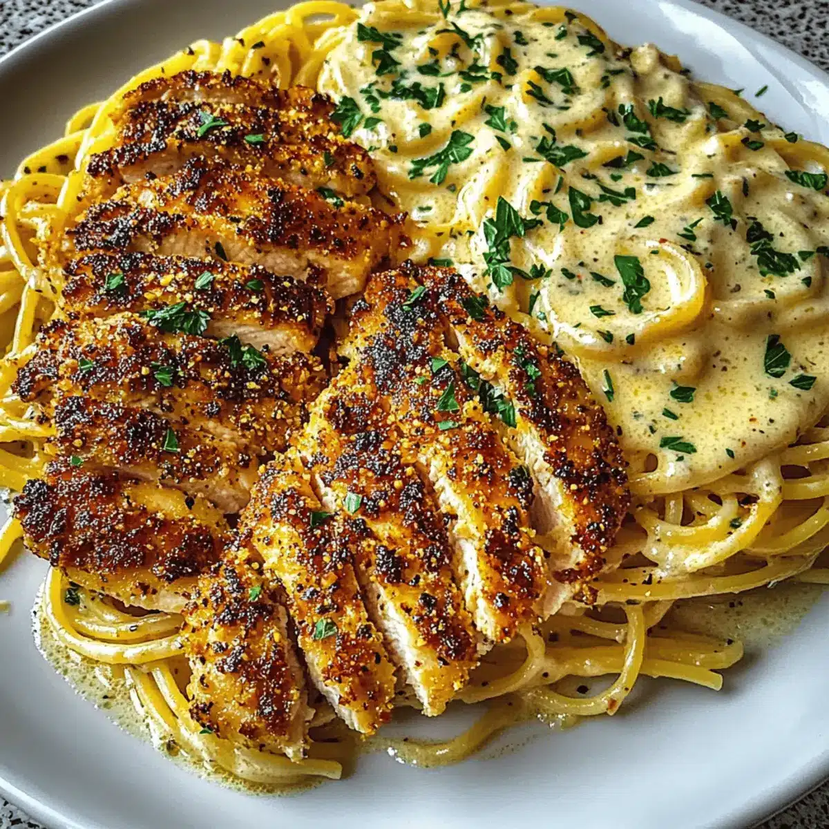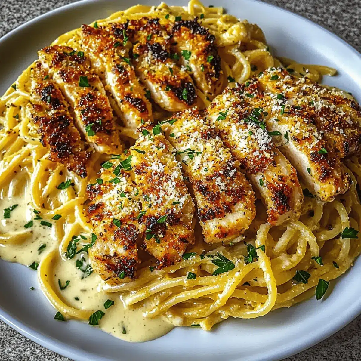 - To plate, divide the creamy spaghetti onto serving plates. Top generously with the sliced parmesan-crusted chicken for added appeal. Garnish each plate with freshly chopped parsley for a burst of color and flavor, and serve hot.