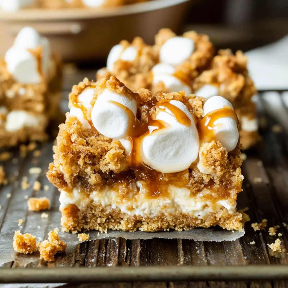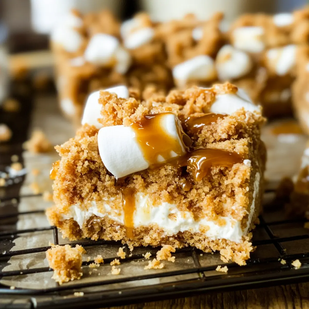 Sprinkle the prepared crumb topping evenly over the marshmallow layer, allowing some marshmallows to peek through. Drizzle a little more Biscoff on top for extra flavor. Return the pan to the oven and bake for an additional 12-15 minutes. Cover with foil if the topping browns too quickly.