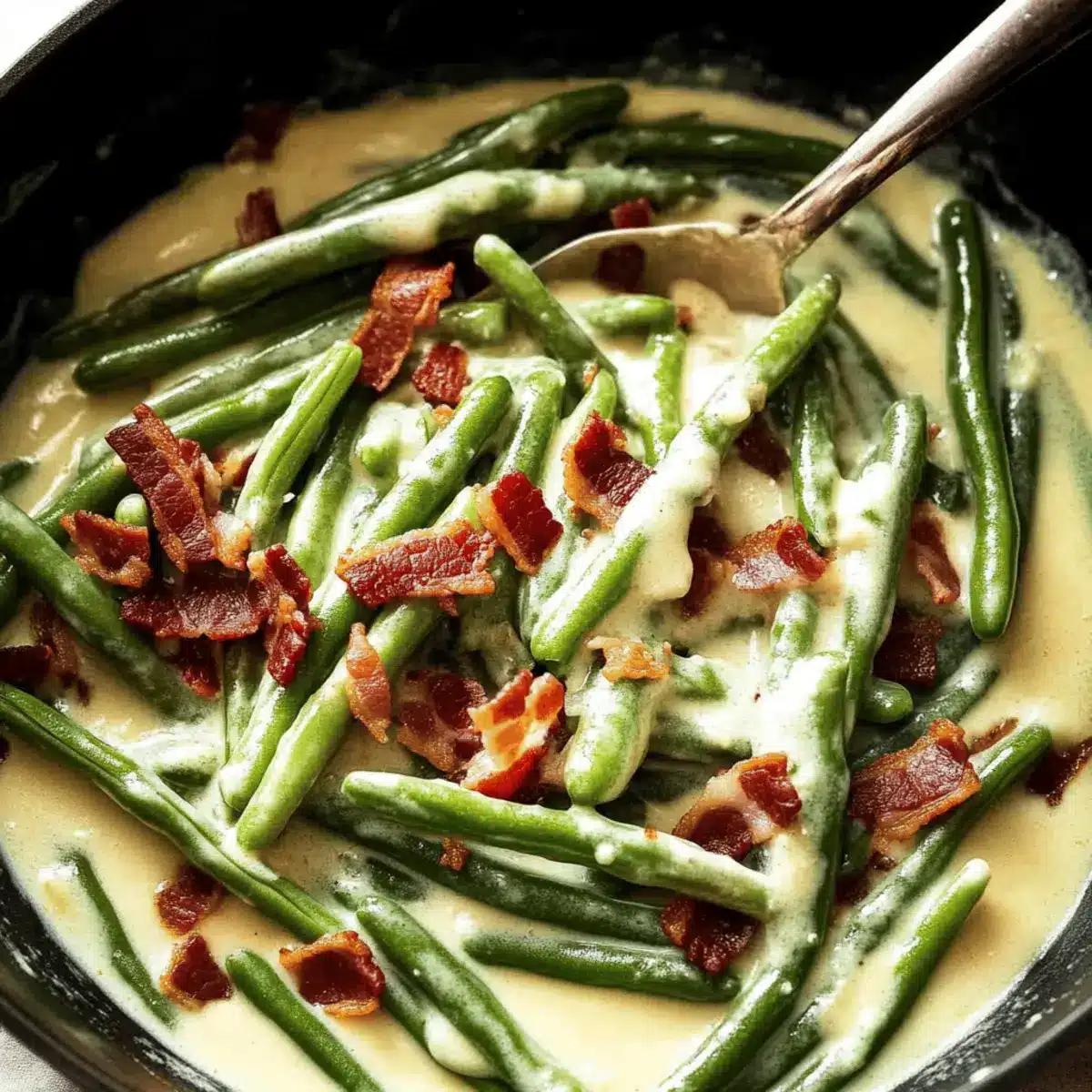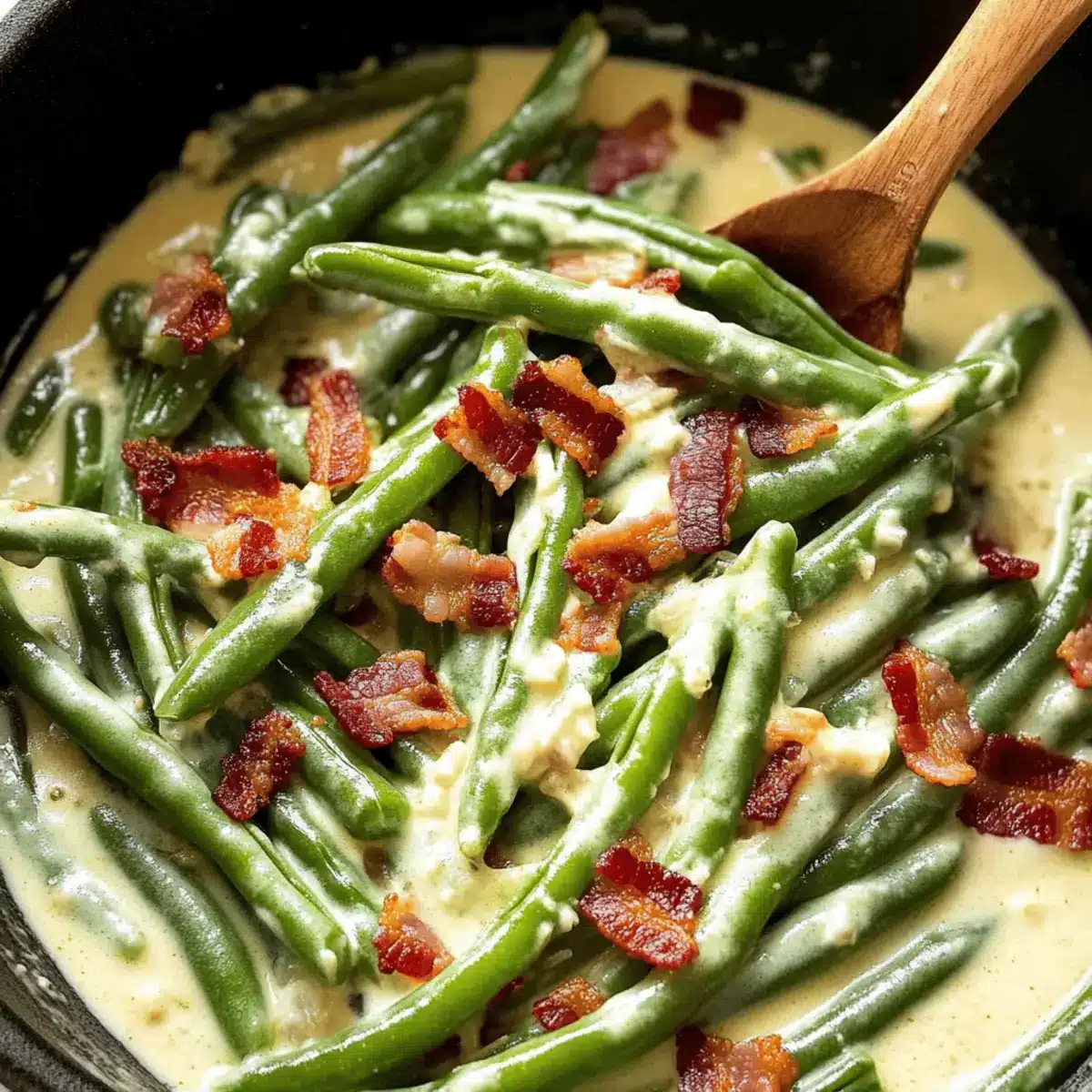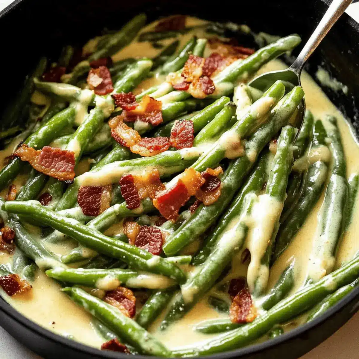- Once the sauce has thickened, remove the skillet from heat. Transfer the creamy green beans to a serving bowl, and add the reserved crispy bacon on top. Sprinkle additional Parmesan cheese before serving.