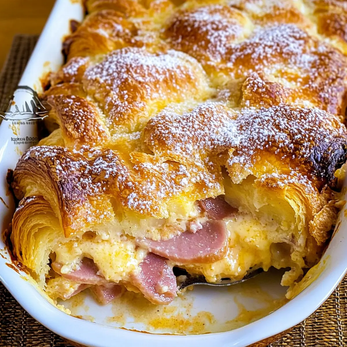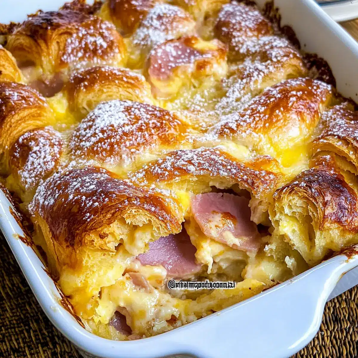 • Get ready to whip up a delicious breakfast casserole that brings together buttery croissants with smoky ham and gooey cheese!