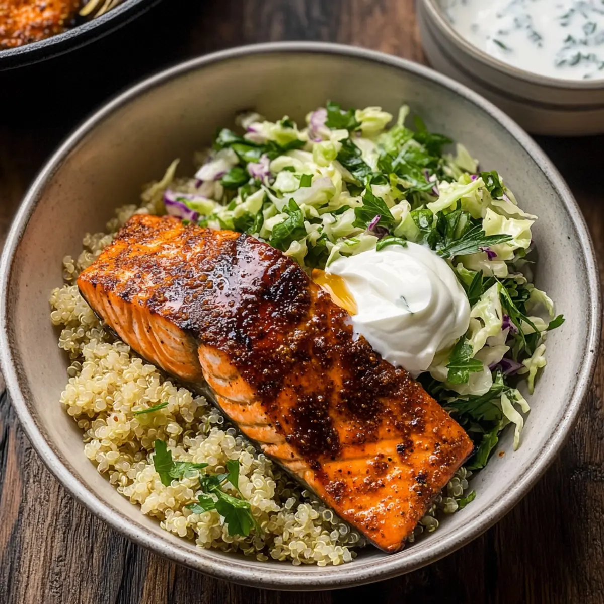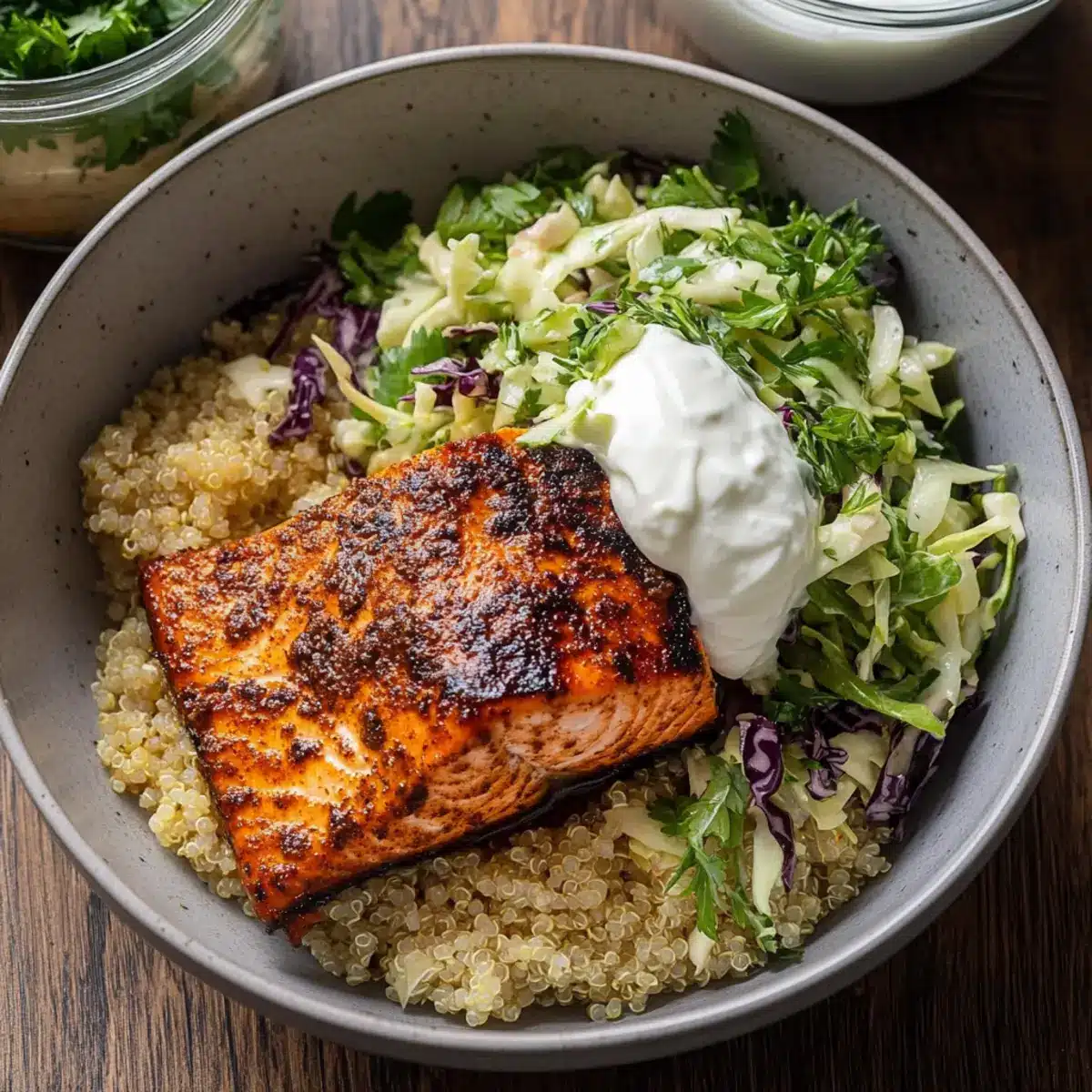 - Assemble your bowls by placing quinoa in the bottom, topping with flaky salmon, herby slaw, and a dollop of creamy yogurt.