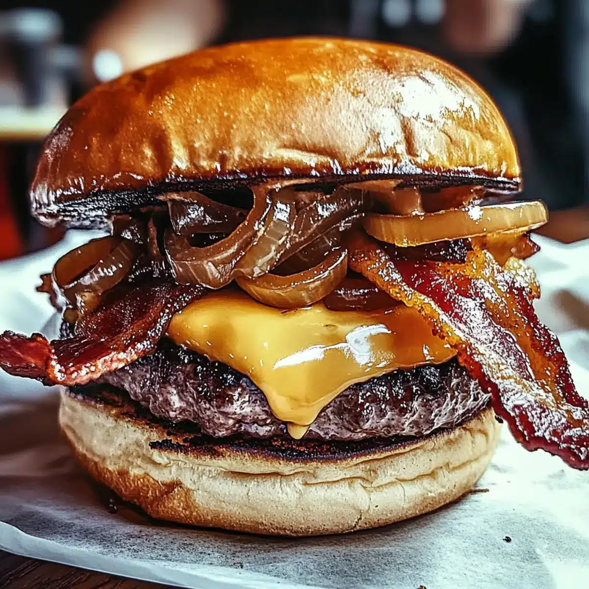 - To assemble, layer the bottom of the toasted brioche bun with a patty, caramelized onions, 2 slices of bacon, a dollop of sauce, and the bun top.
