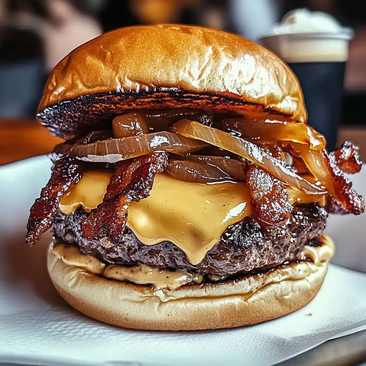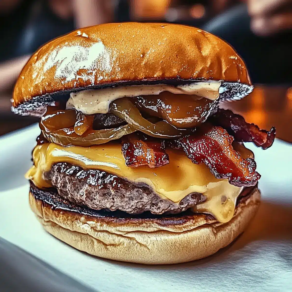 - Assemble the Burgers: Start with the bottom bun, layer with a beef patty, caramelized onions, and bacon. Drizzle with sauce and top with the other bun.