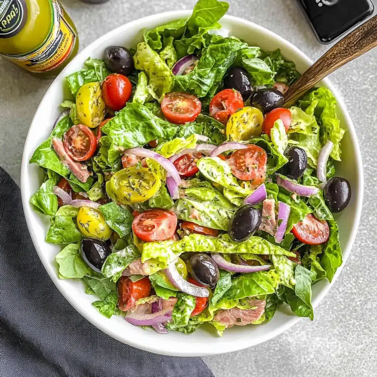 - Dress the Salad: Drizzle Italian dressing over the salad and toss to ensure even coating.