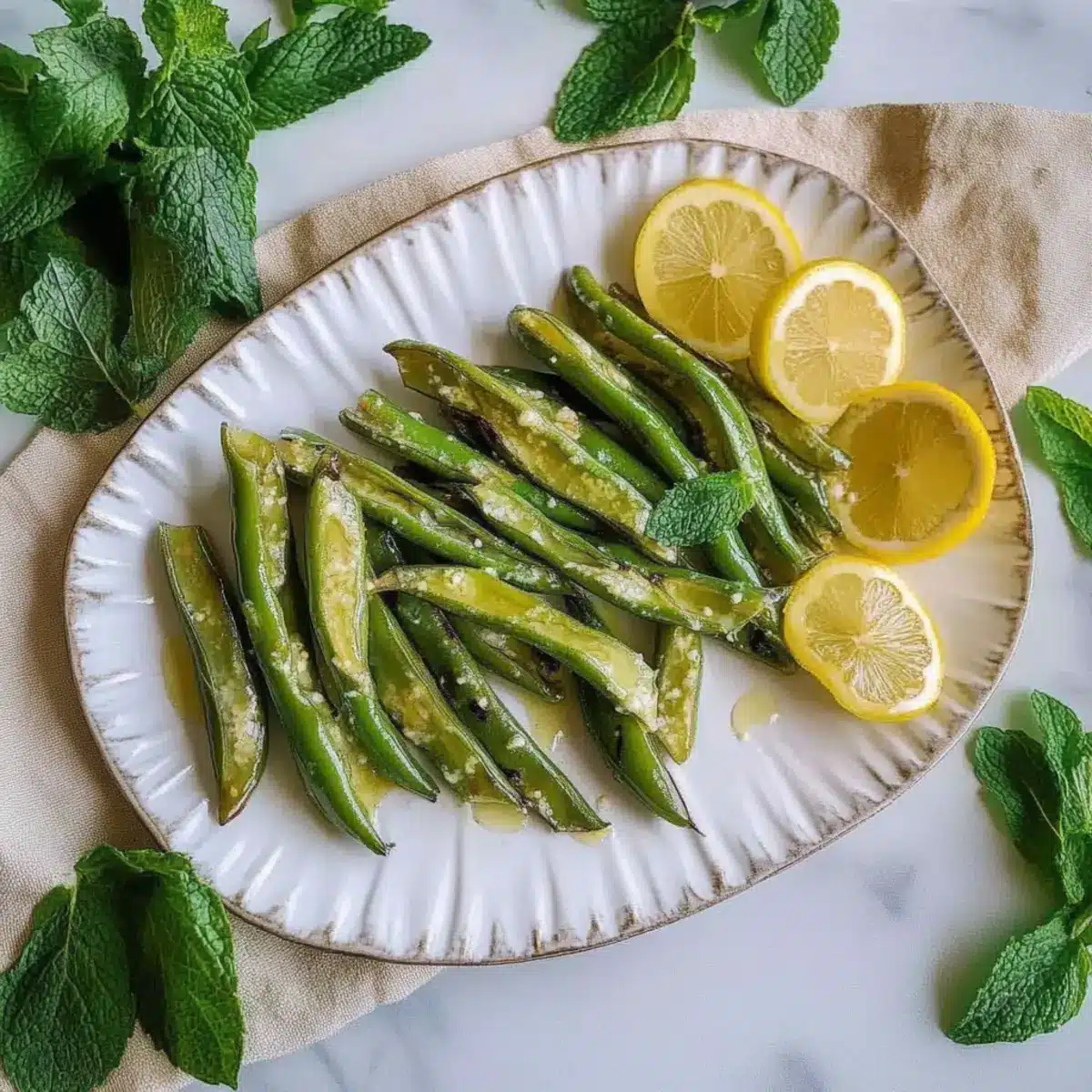 Once the beans are perfectly grilled, arrange them elegantly on a serving plate. Drizzle the prepared lemon-mint dressing generously over the beans, allowing the flavors to mingle. For an inviting touch, garnish with fresh mint leaves, and serve immediately to highlight their irresistible flavors and textures.