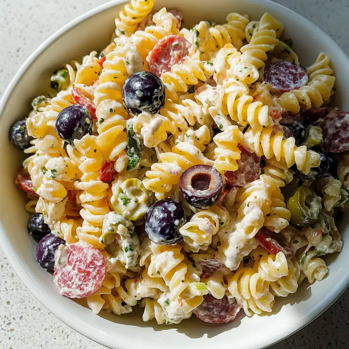 - Combine Ingredients: Add cooled pasta, salami, pepperoni, provolone, red onion, and olives to the dressing. Toss gently until well mixed.