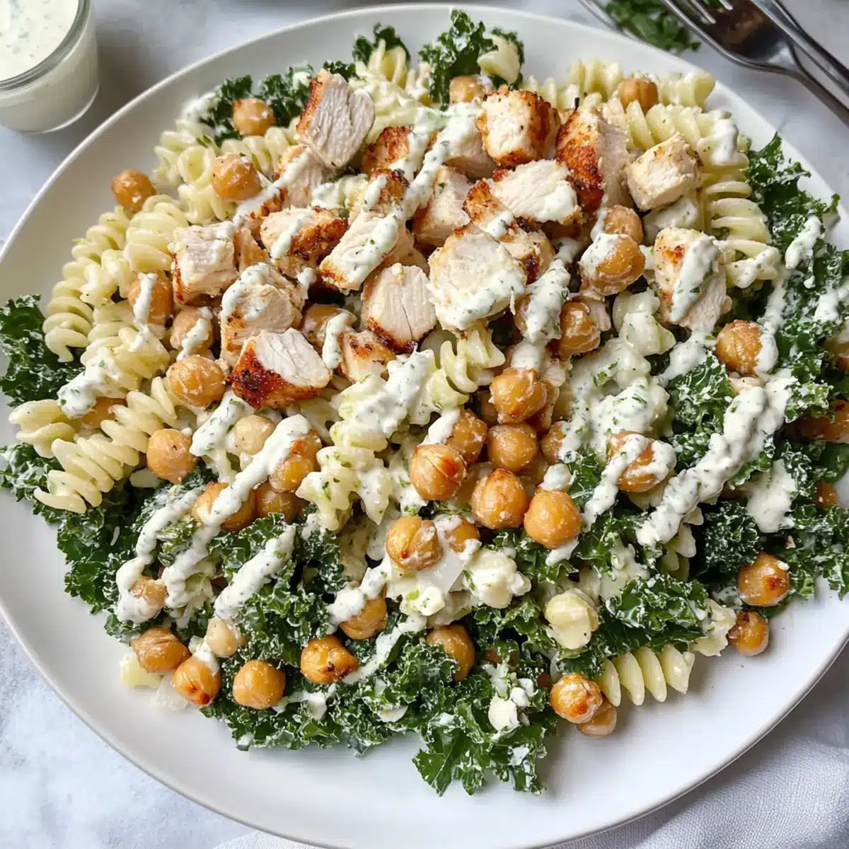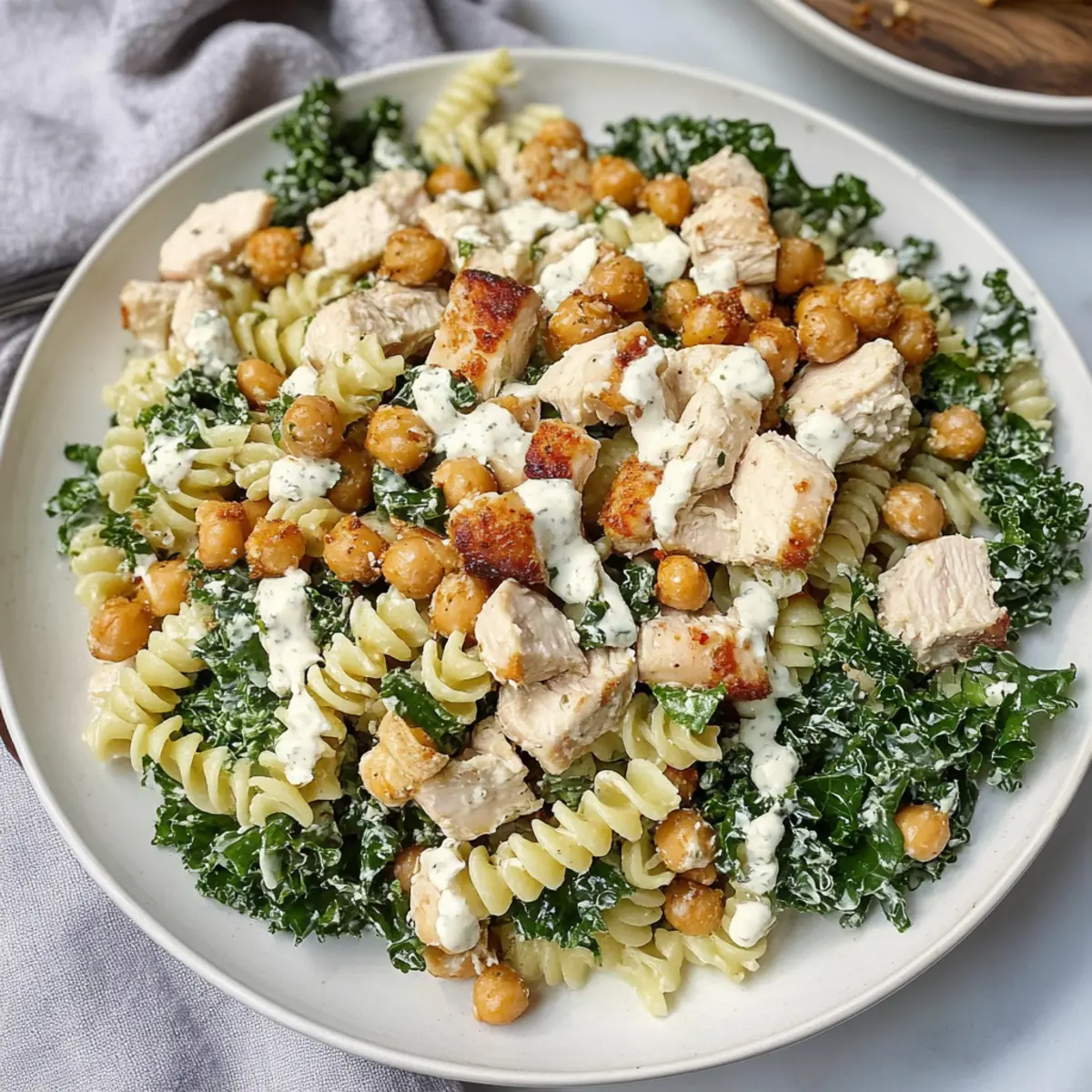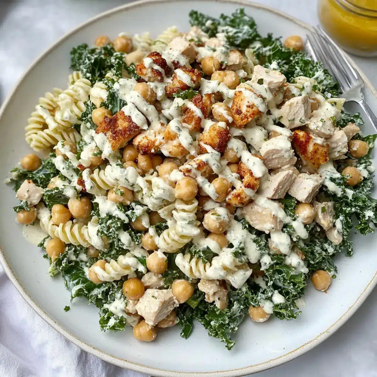 - Drizzle the creamy dressing over the kale, chicken, and pasta mixture, tossing gently until all ingredients are coated. Sprinkle the crispy chickpeas on top before serving.
