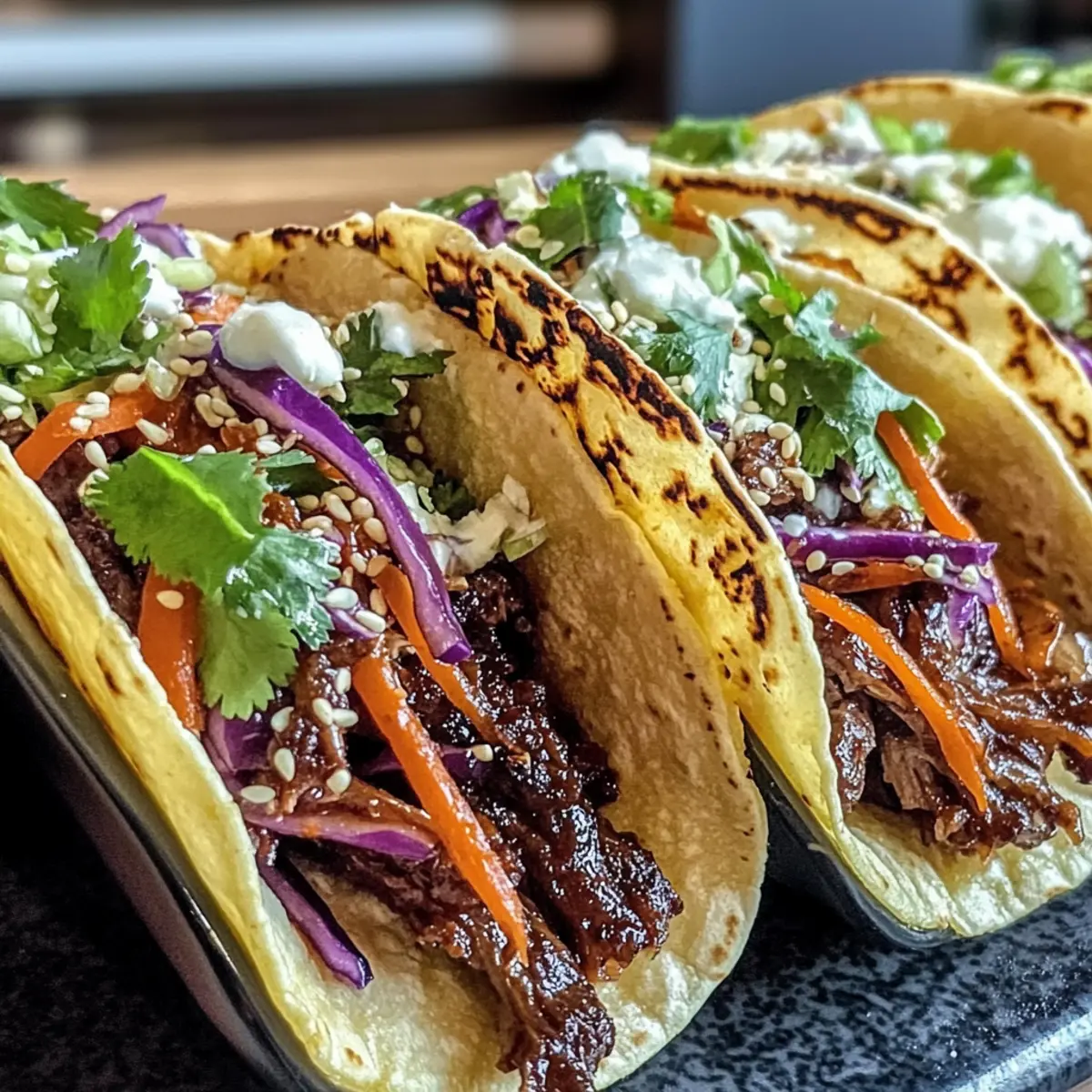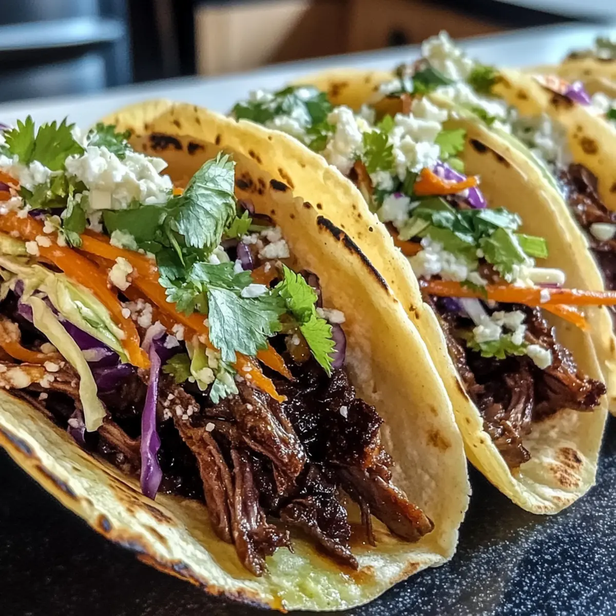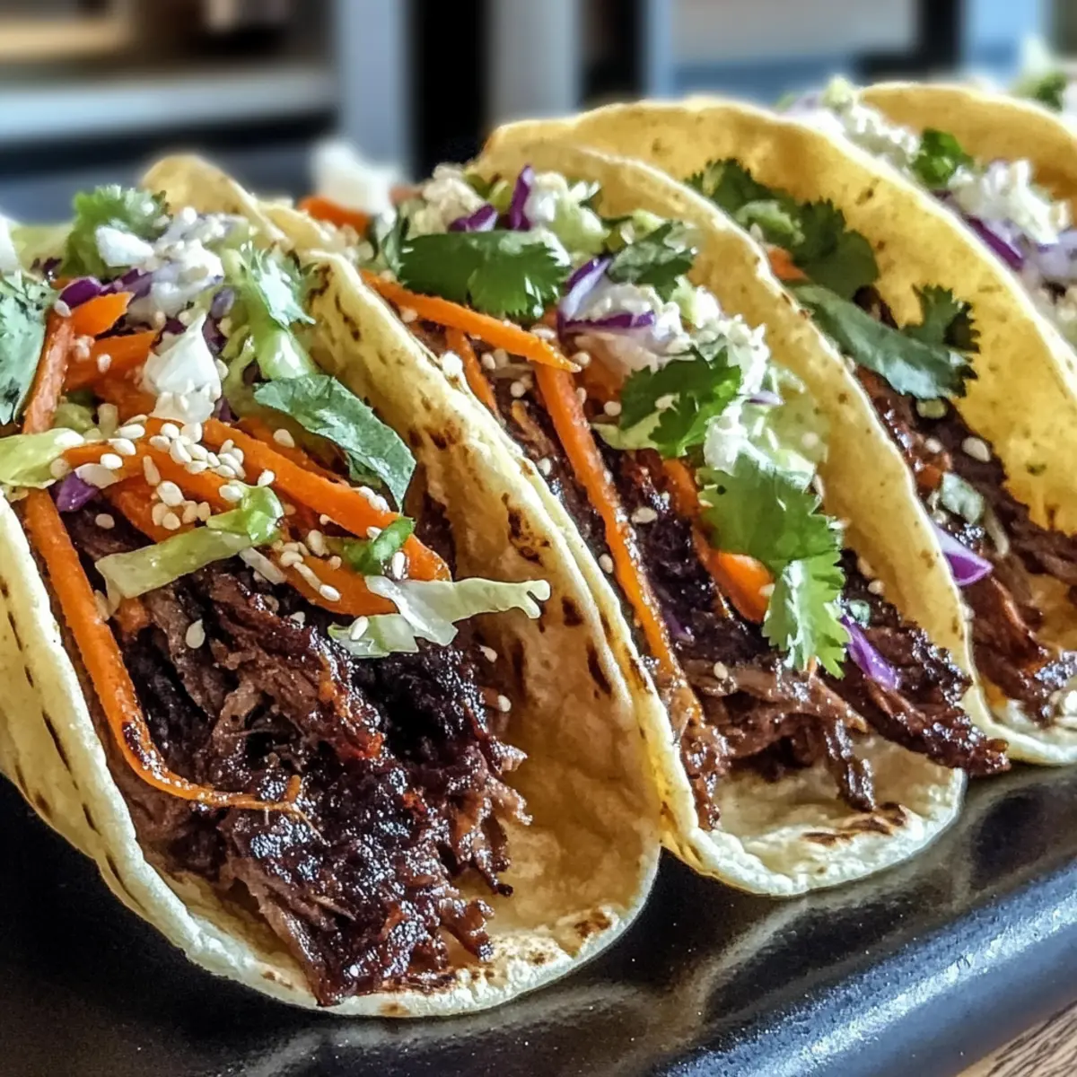 - Assemble the Tacos: After cooking, shred the beef and warm tortillas. Fill each tortilla with beef and top with gochujang slaw.