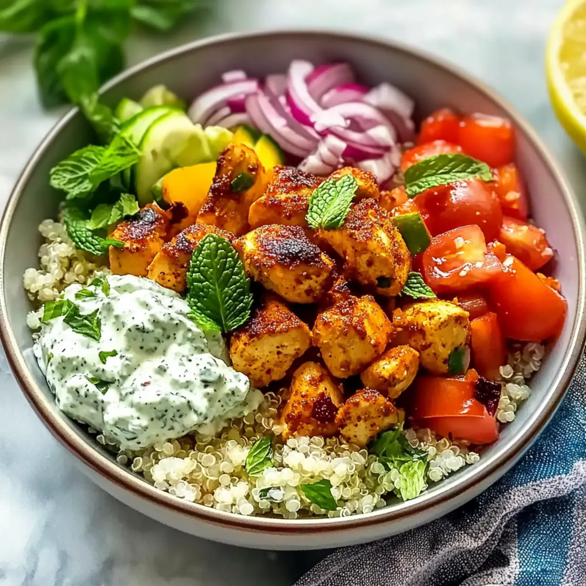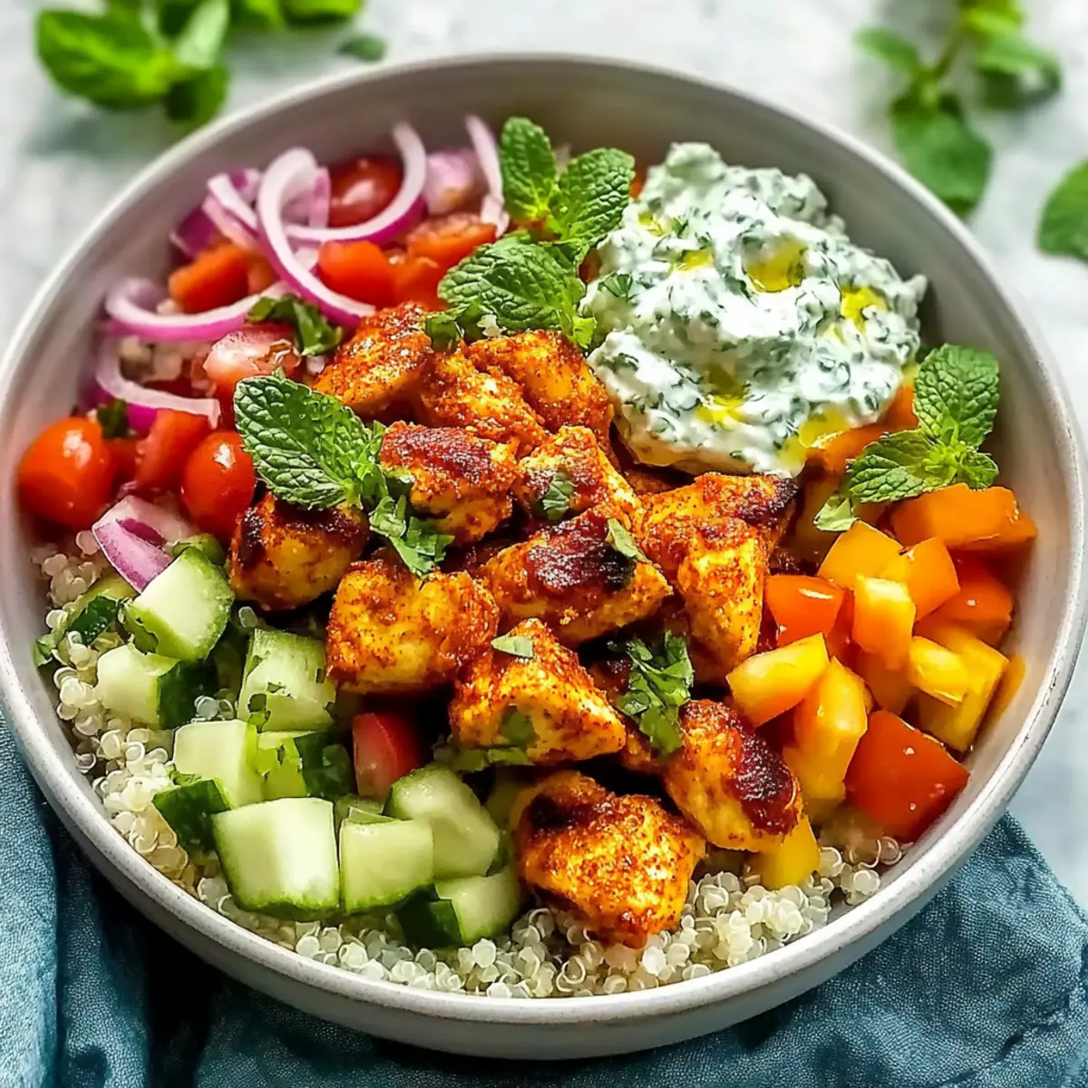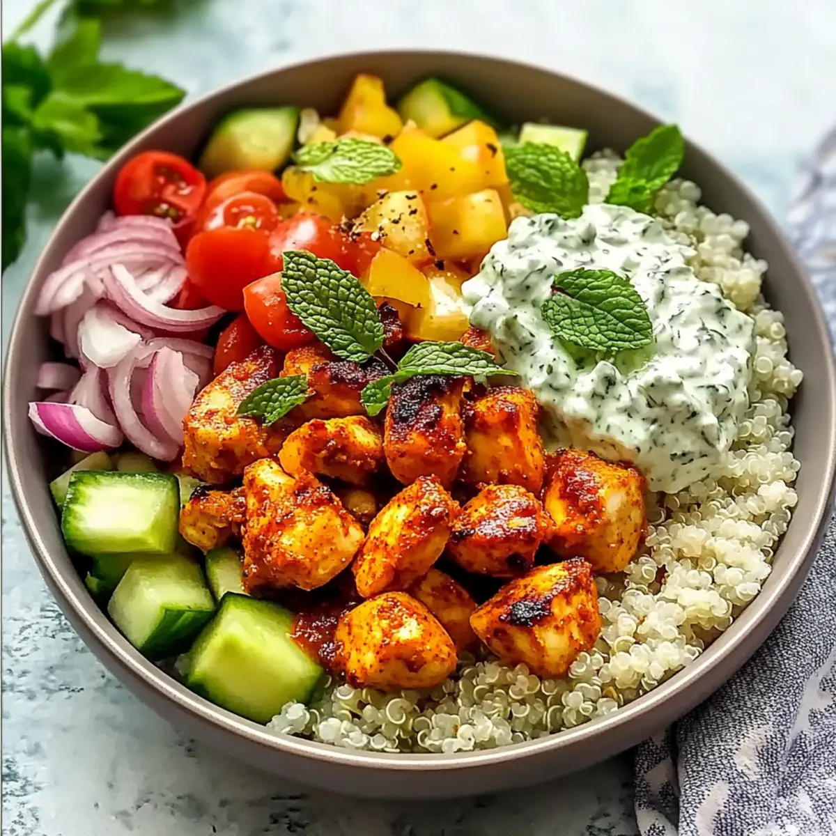 - Assemble Bowls: Start with quinoa, add chicken, vegetable salad, tzatziki, feta (if desired), and garnish with mint and olive oil.