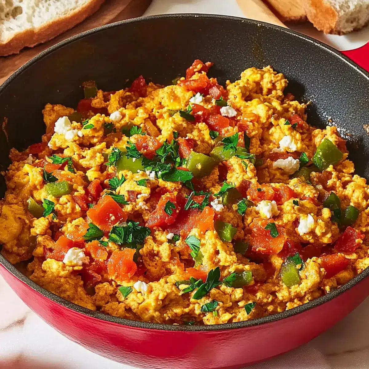 • Perfect Pairings: Menemen pairs beautifully with crusty bread; this not only complements the dish but also helps scoop up the delicious, saucy mixture.