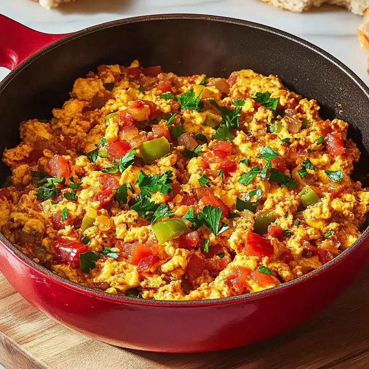 Finely chop a handful of fresh parsley and sprinkle it generously over the completed Menemen for a pop of color and flavor. Serve this delicious Turkish egg scramble hot, preferably with some crusty bread to soak up all the flavorful juices. This dish is sure to be a hit any time of the day!