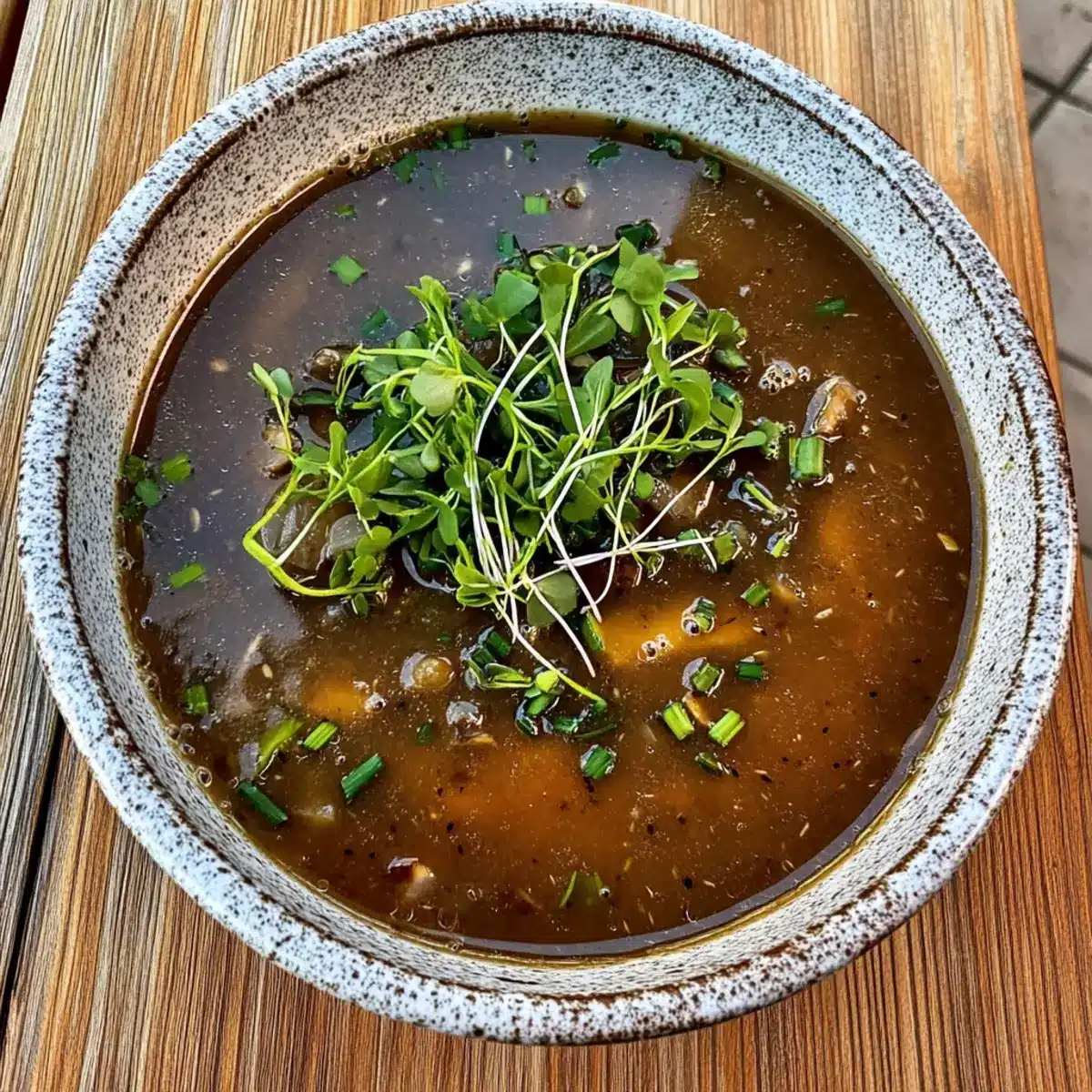 Ladle the warm, aromatic mushroom and onion soup into bowls and top generously with fresh microgreens and chives. Serve immediately to enjoy the comforting flavors and delightful textures of this savory bowl of goodness.