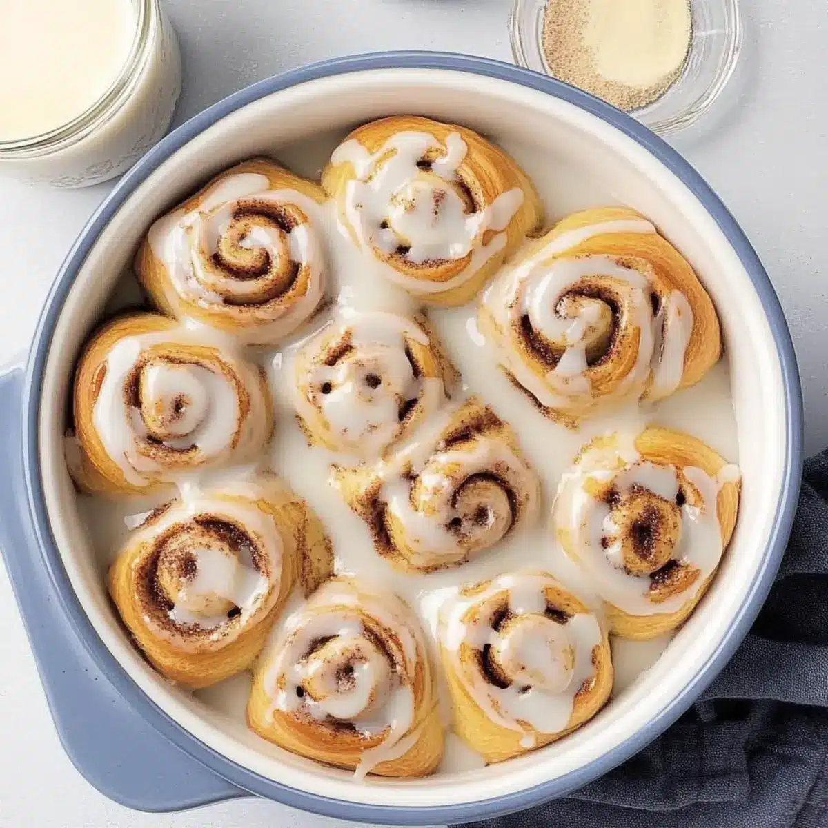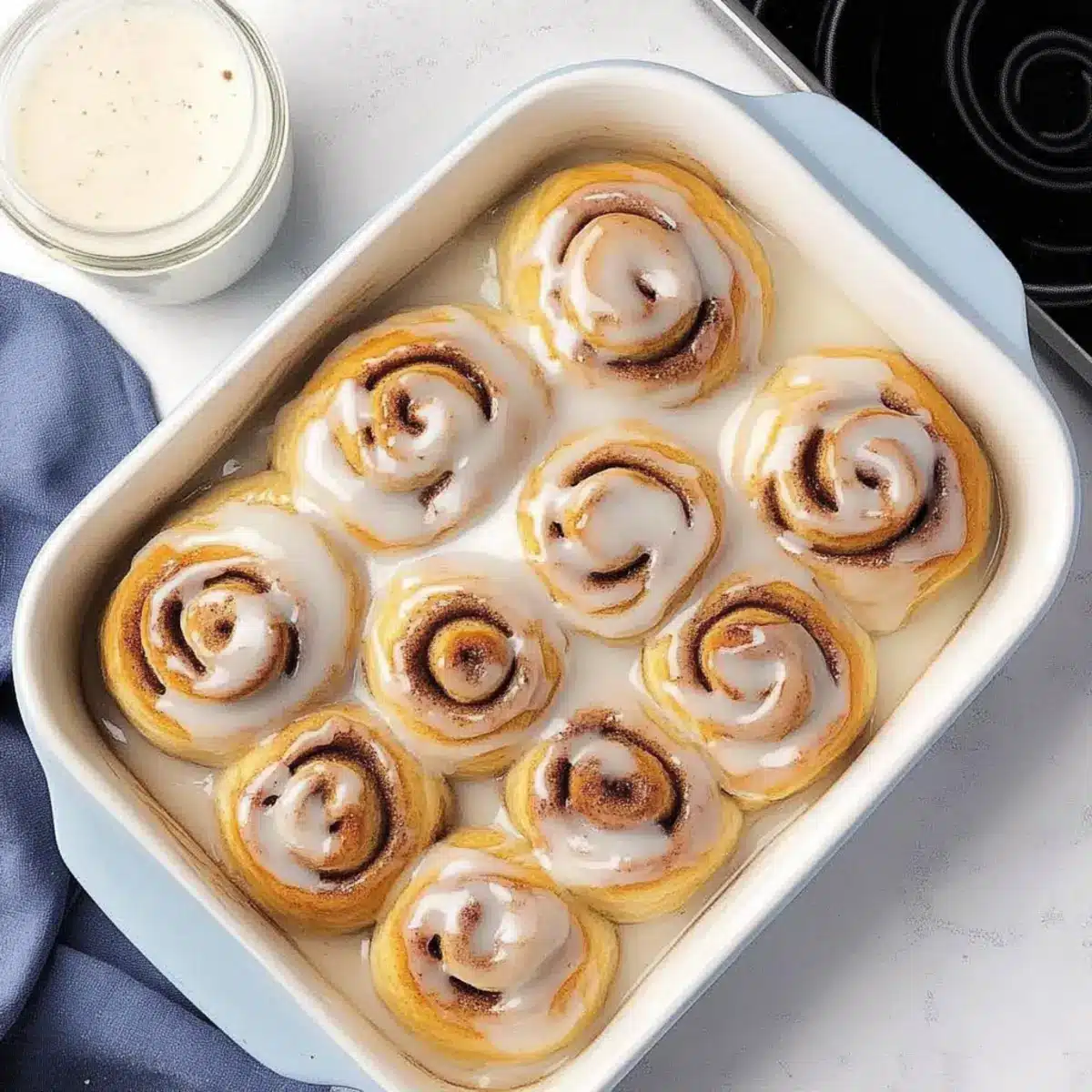 After baking, remove the rolls from the oven and allow them to cool for 5 minutes. Drizzle the warm glaze generously over the top, allowing it to seep into the nooks and crannies. Serve immediately for a sweet breakfast experience that everyone will savor!