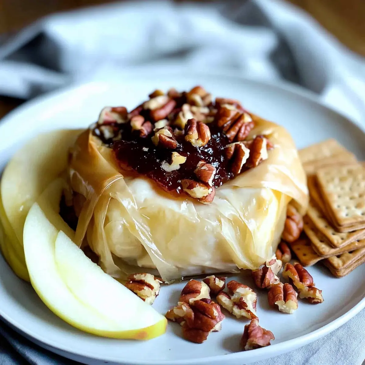 One common issue is tearing the phyllo dough while assembling. To prevent this, handle it with care and keep the sheets covered with a damp cloth to avoid drying out. If you’re still concerned about tearing, simply use extra phyllo layers—this is often a great way to yield a more decadent and flaky outcome! Additionally, if you notice that the brie isn’t melting as expected, ensure that your oven is preheated sufficiently before baking.