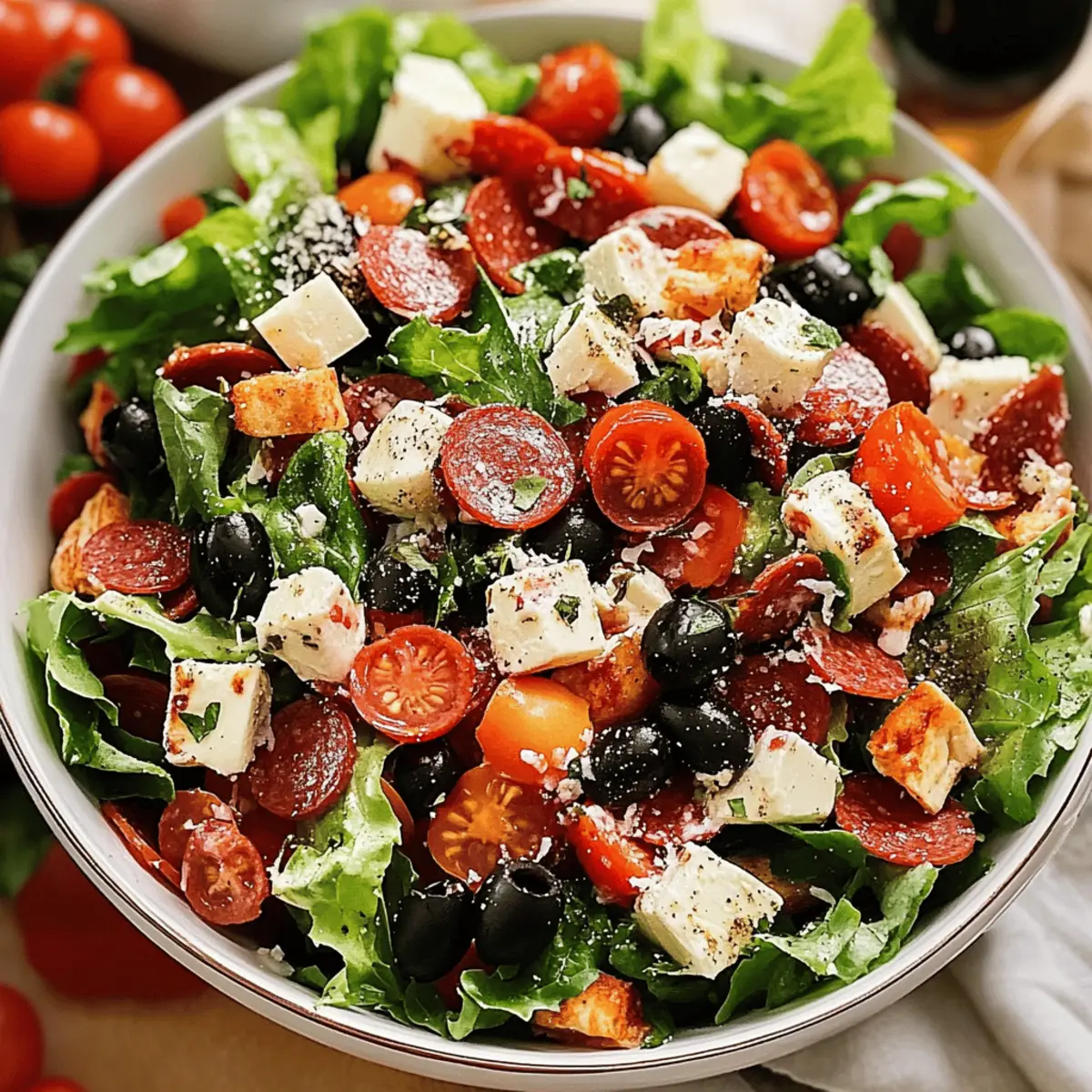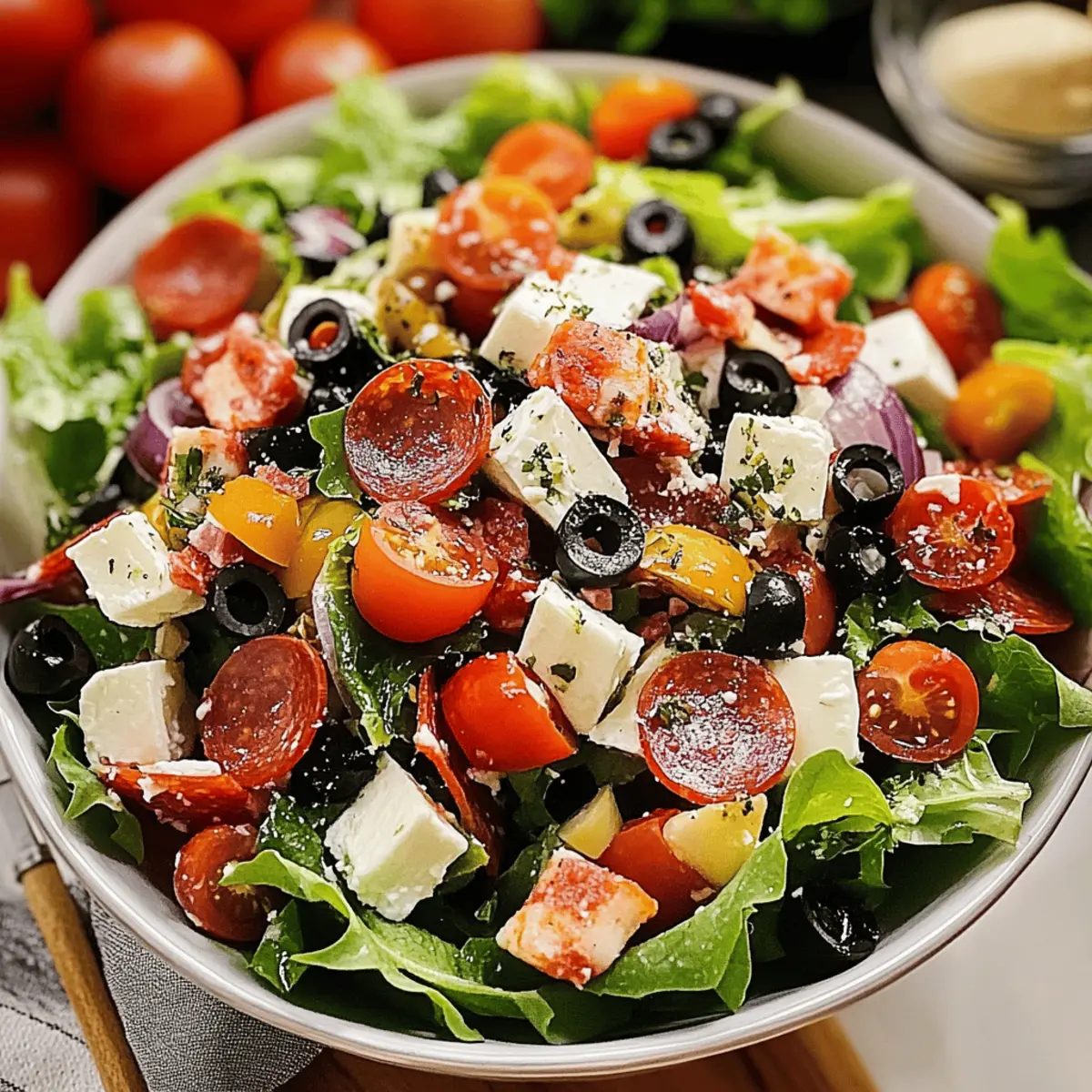 Antipasto Platter: Serve an assortment of olives, cured meats, and marinated vegetables for a wonderful appetizer. The salty, tangy flavors create an inviting start while playing well with the savory notes of the Pizza Salad.