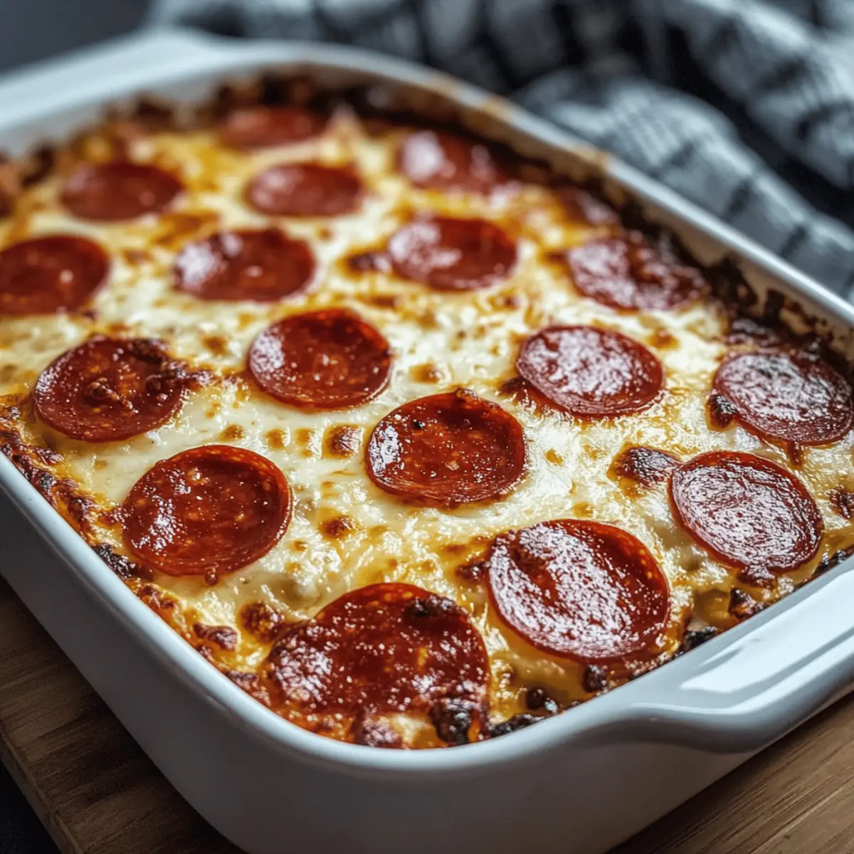 - Pour the mixture into your greased baking dish, gently spreading it out with a spatula for an even layer. Sprinkle the reserved mozzarella and remaining turkey pepperoni on top.