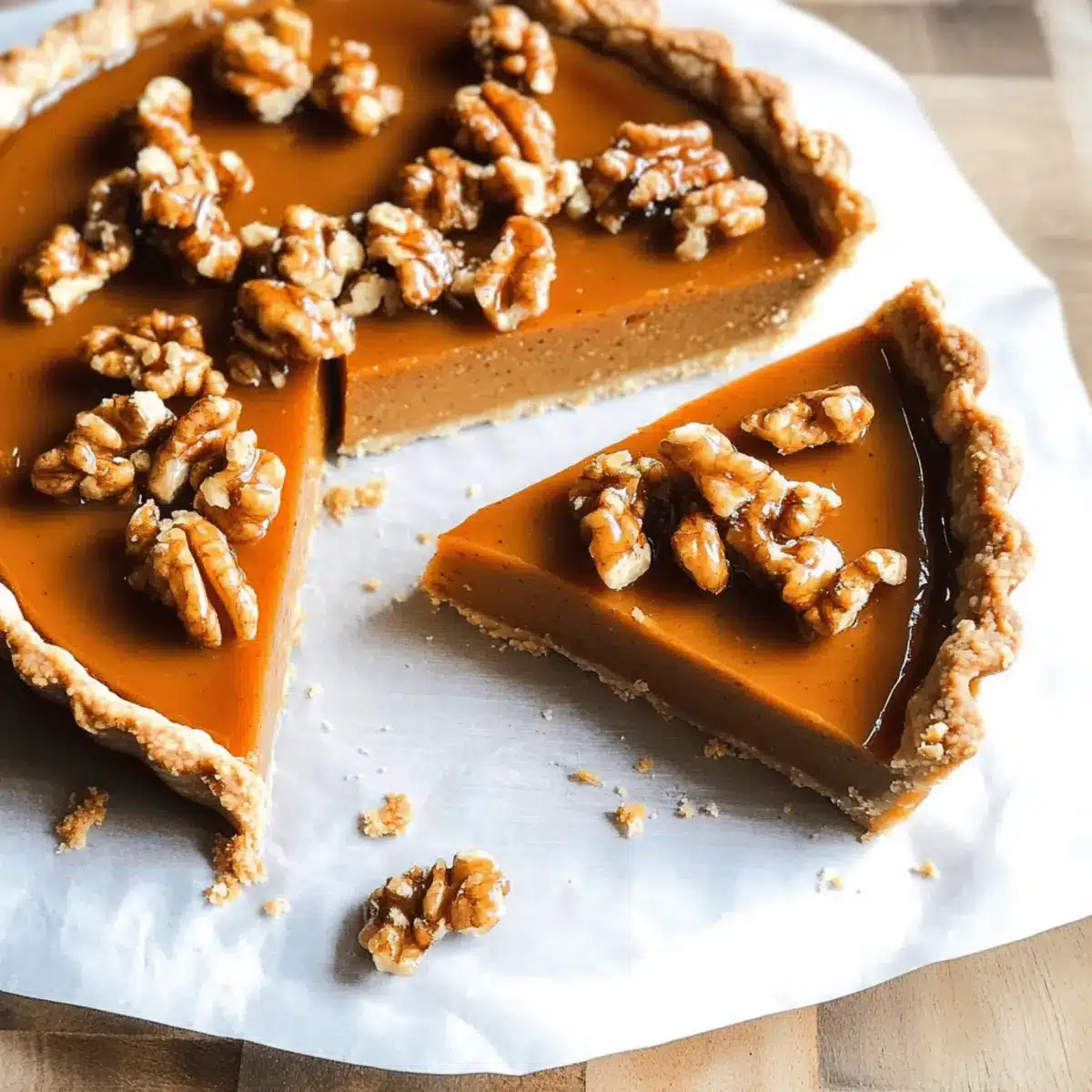 Irresistible flavors: This Pumpkin Caramel Tart combines the essence of fall with a buttery walnut crust, creating a flavor profile that’s rich and inviting.