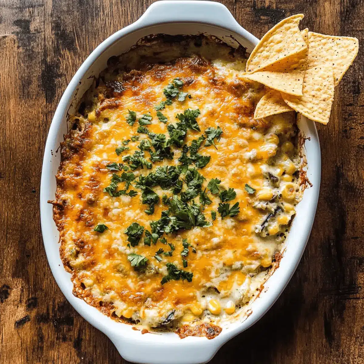 After baking, remove the dip from the oven and let it sit for a few minutes. Garnish with chopped cilantro for a fresh finish. Serve your Roasted Poblano Corn Dip warm with tortilla chips, toasted bread, or fresh veggies, allowing your guests to indulge in its creamy, rich flavors.