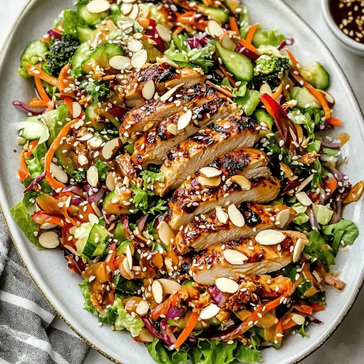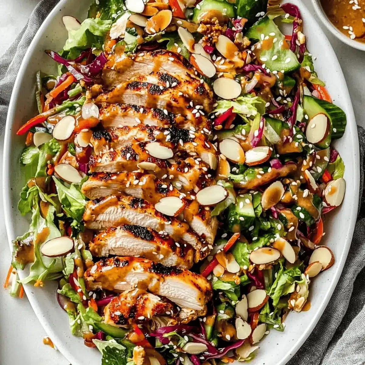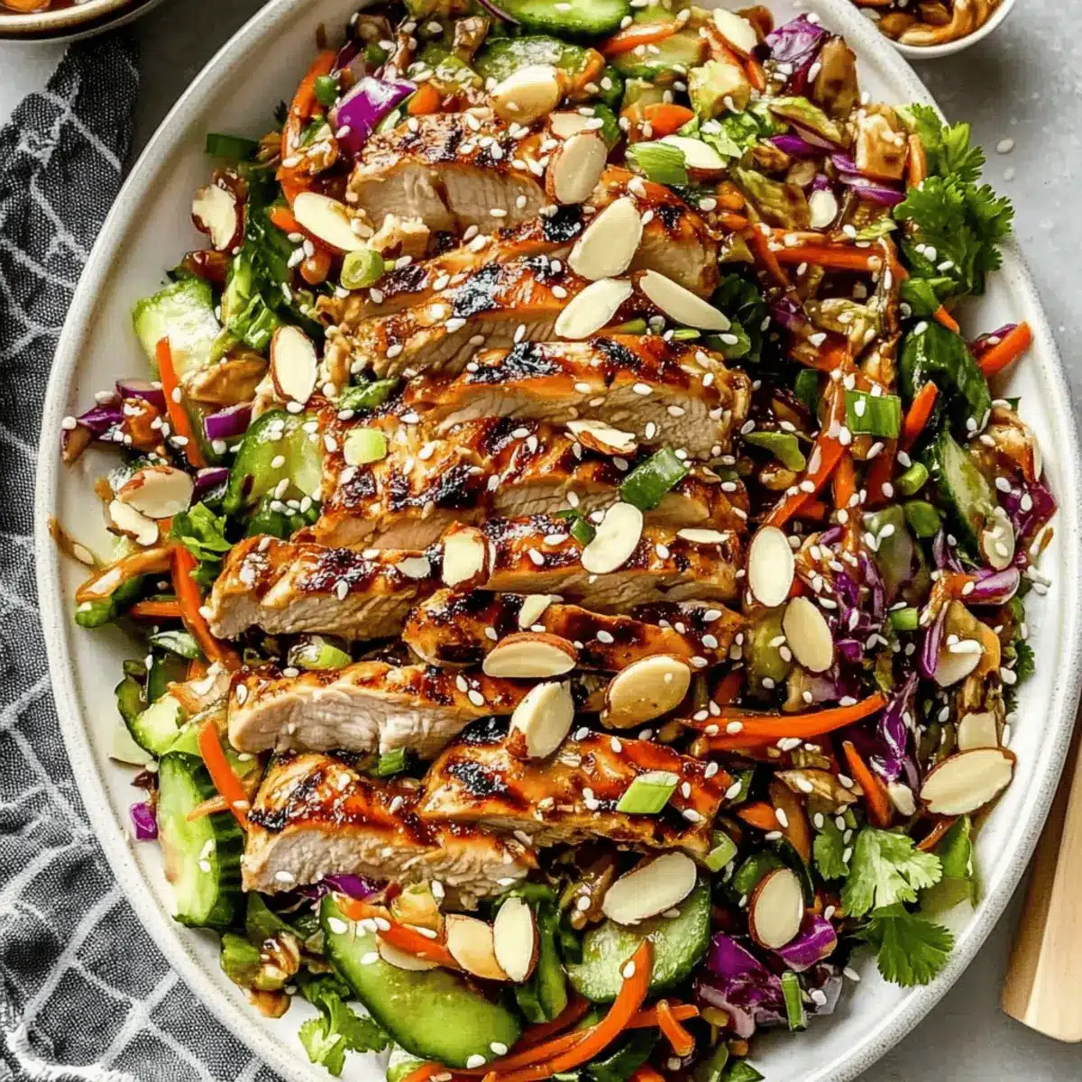 Once the chicken is cooked, slice it into bite-sized pieces. Transfer the mixed salad to a large platter, then top with the grilled chicken and drizzle the sesame ginger dressing generously over the entire salad. Finish with a sprinkle of toasted sliced almonds, roasted cashew halves, and a handful of sesame seeds to add crunch. Garnish with extra cilantro and green onion for a fresh touch.