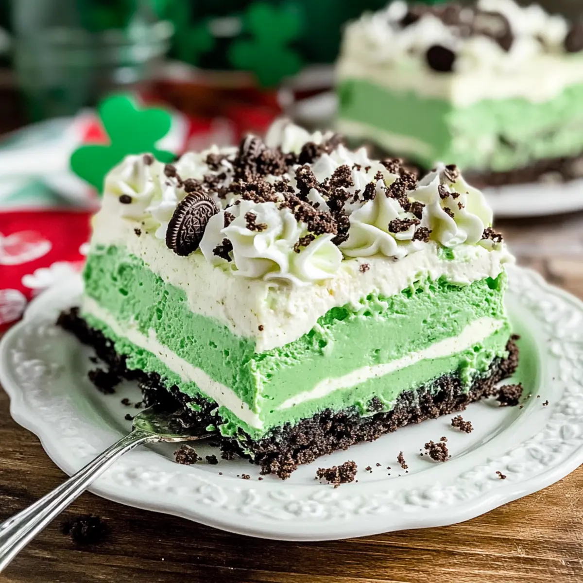 These Shamrock Lasagna delights are a dream for busy cooks looking to save time! You can prepare the crust and cream cheese layer up to 24 hours in advance and chill them in the refrigerator. To maintain quality, make sure to cover the layers tightly with plastic wrap to prevent drying. Additionally, you can combine the pudding mix with milk and refrigerate it for up to 3 days before serving. Just remember to fold in the whipped topping and mint extract right before assembling the layers. When it’s time to enjoy, simply layer the mint pudding on top and Garnish for eye-catching flair—your guests will be amazed at how effortlessly delicious it all is!