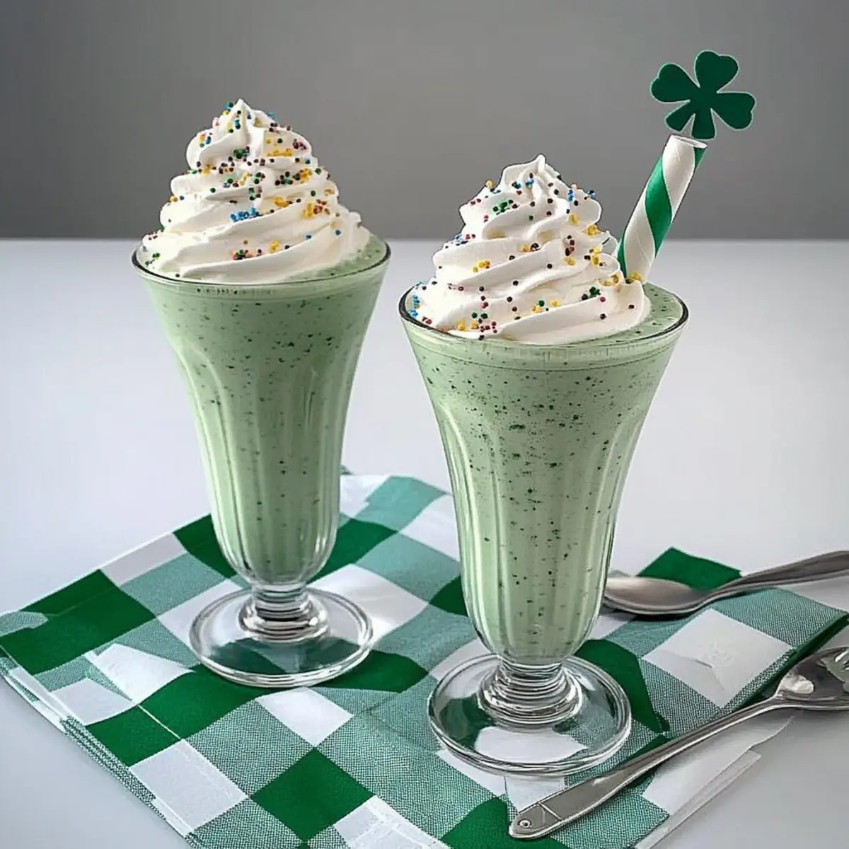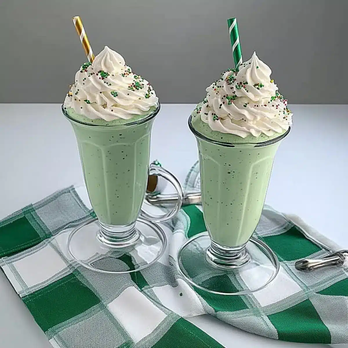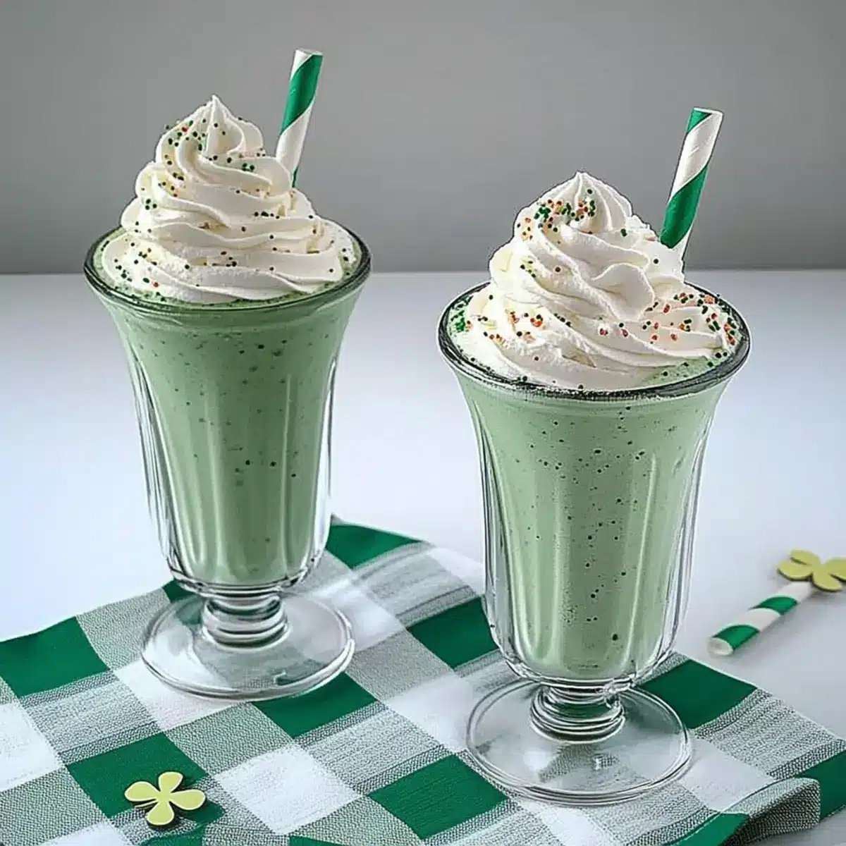 Top each glass generously with whipped cream to create a fluffy crown. For added visual appeal, sprinkle colorful festive toppings like sprinkles or crushed cookies on the whipped cream. If you’re feeling fancy, finish each shake with a maraschino cherry perched on top, making your Shamrock Shake an irresistible delight!