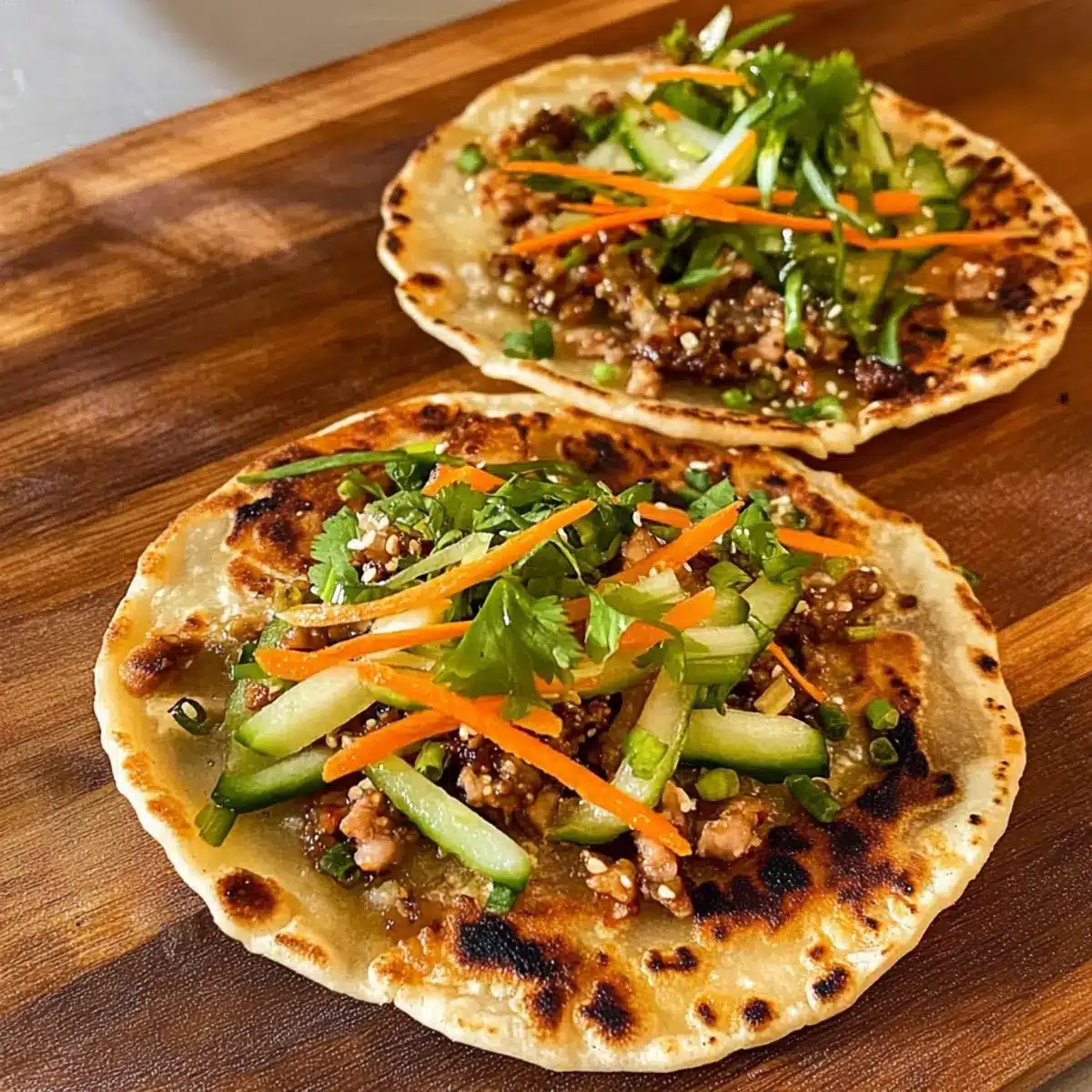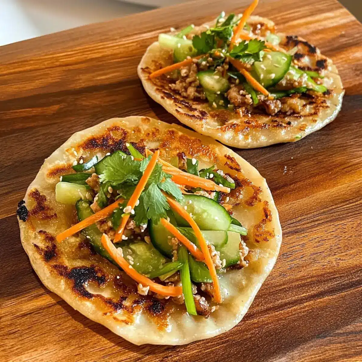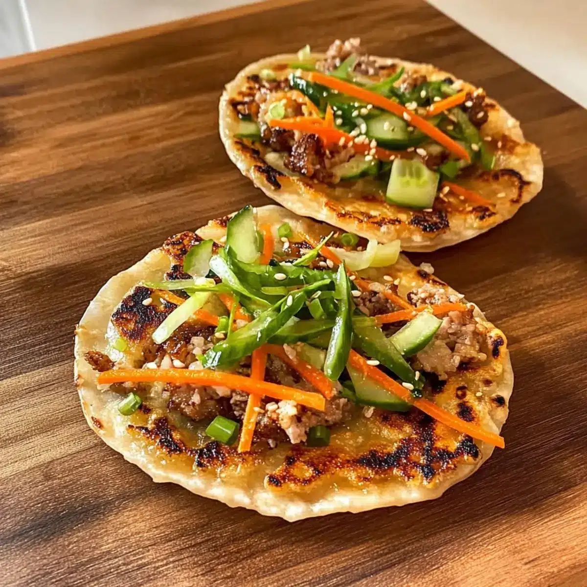 Once the Smash Dumpling Tacos are crispy and golden, remove them from the skillet and arrange them on a serving platter. Top generously with shredded carrots, cucumber, spring onions, and fresh coriander. Drizzle some chili oil over the top for an extra kick, and serve hot, inviting everyone to dig into this delightful fusion dish!