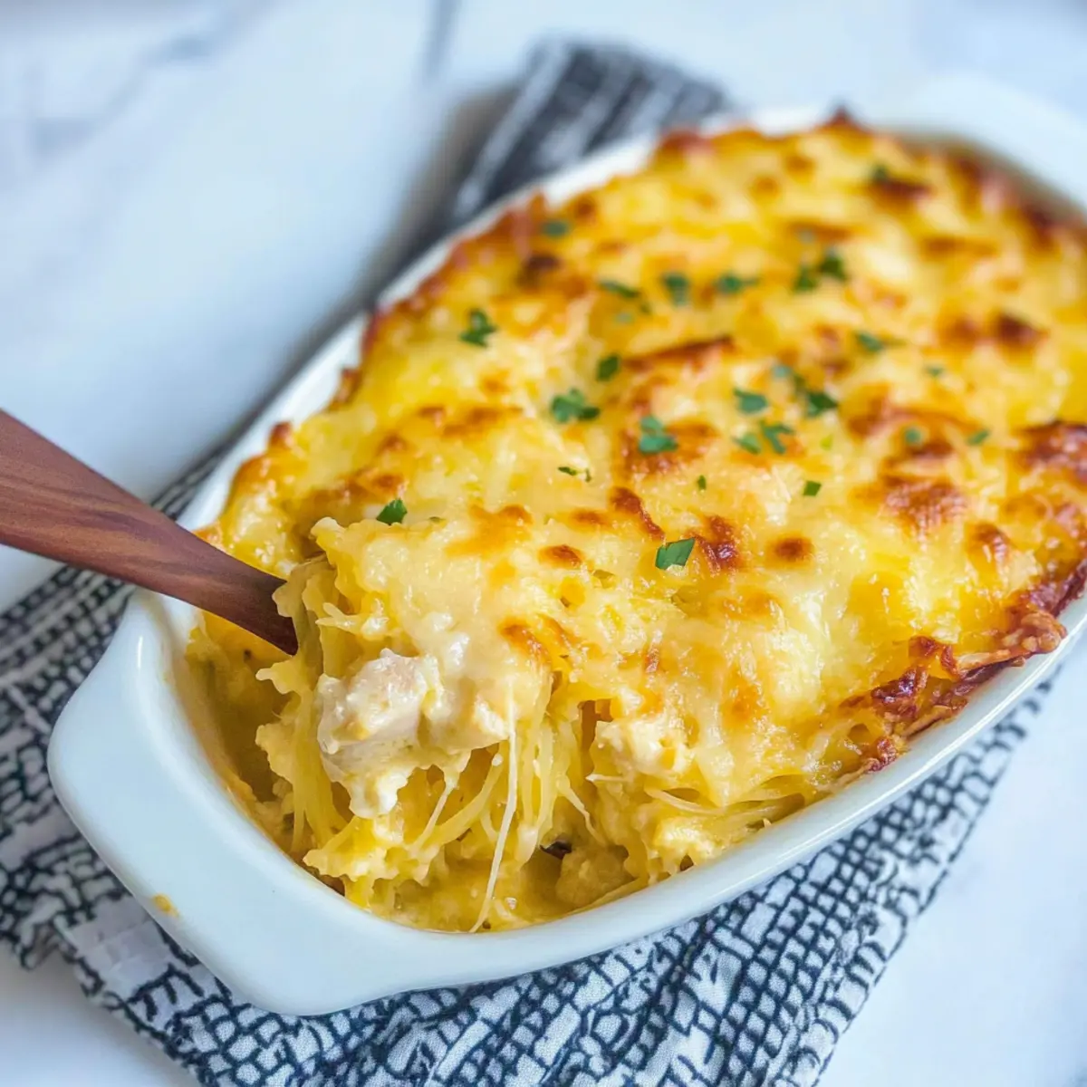 Deliciously Guilt-Free: This creamy Spaghetti Squash Au Gratin allows you to indulge without breaking your diet. Rich, Comforting Flavor: The blend of cheese and spices creates a savory delight that satisfies cravings. Quick and Easy: With minimal prep and cook time, it’s perfect for busy weeknights! Versatile Meal: Swap chicken for ground beef or add your favorite veggies like spinach for a twist. Plus, it pairs beautifully with a fresh salad or grilled meats for a complete meal. Transform your dinner routine with this delightful recipe that your whole family will love!