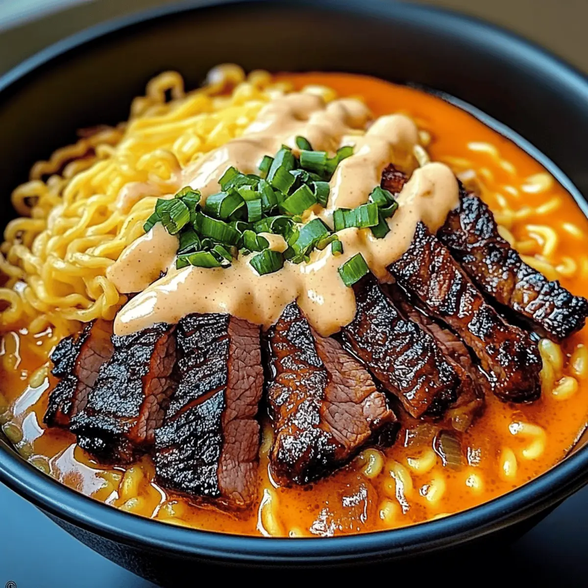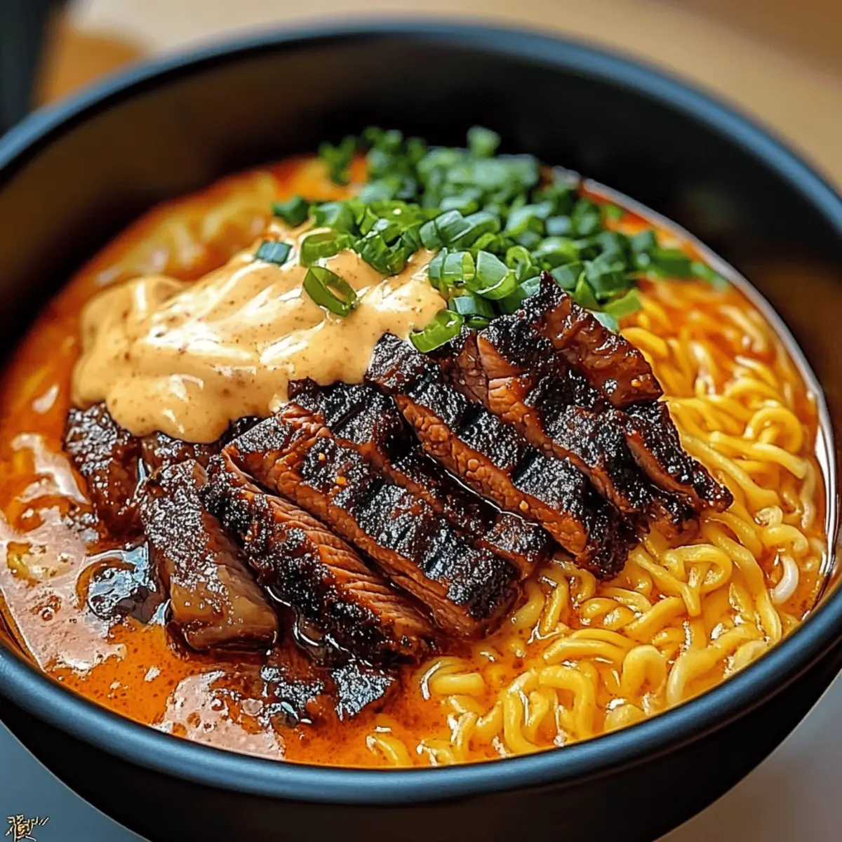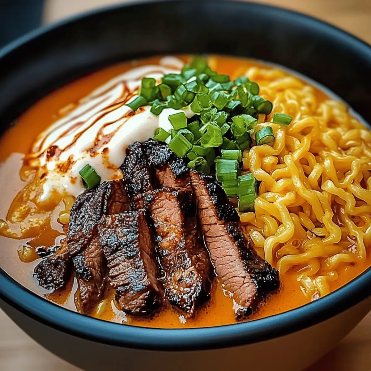 To create your perfect Spicy Korean Ramen with Grilled Beef, divide the cooked noodles and hot broth into serving bowls. Top each bowl generously with sliced grilled beef. To finish, drizzle a spoonful of the creamy sauce over the beef and garnish with fresh green onions and black sesame seeds for a crunchy, colorful presentation that will impress anyone at your dinner table.