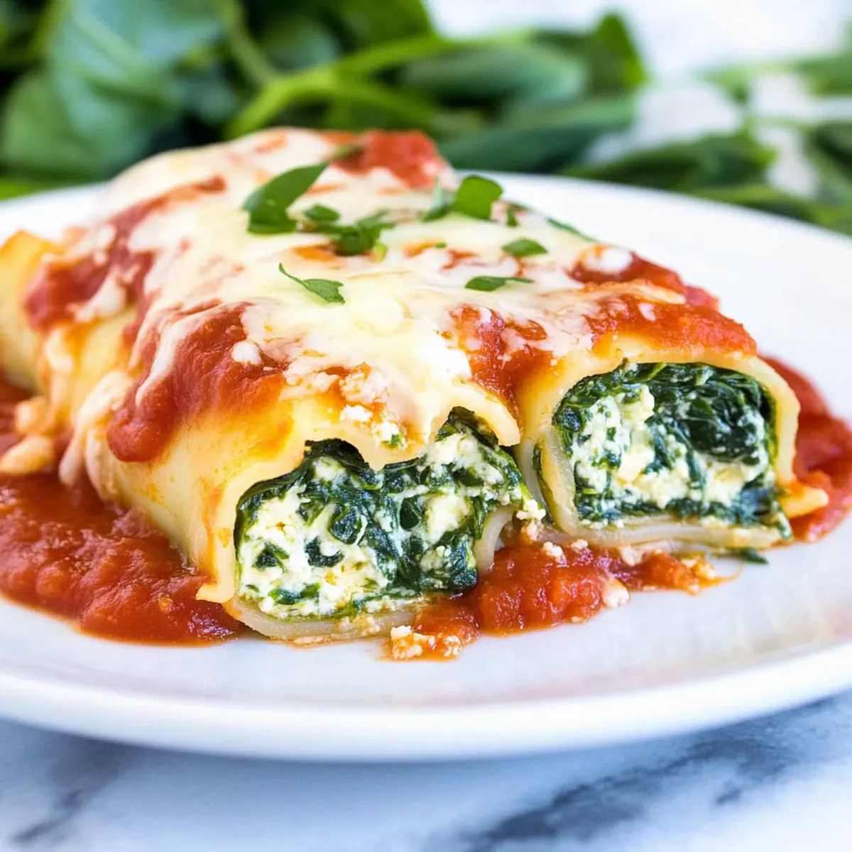 Preheat your oven to 350°F (175°C). Spread a thin layer of marinara sauce evenly across the bottom of a 9×13 inch baking dish. On a flat lasagna noodle, spoon about 2-3 tablespoons of the spinach filling across the width. Gently roll it up from one end to the other, placing the seam side down in the prepared dish. Repeat this process with the remaining noodles and filling, ensuring they are snugly fit together.