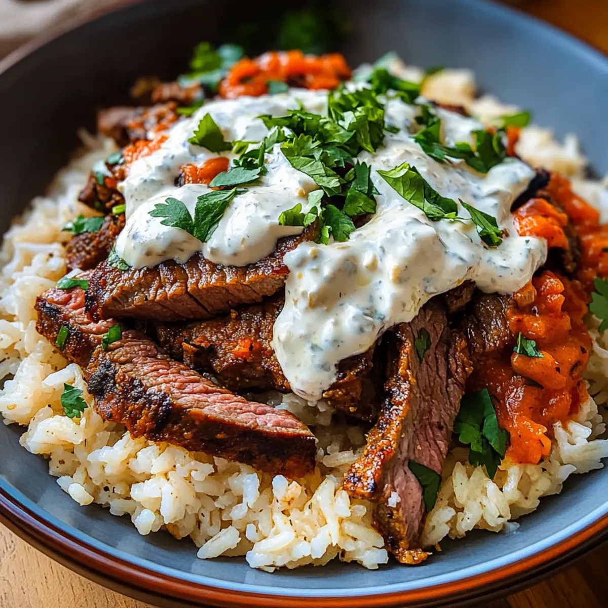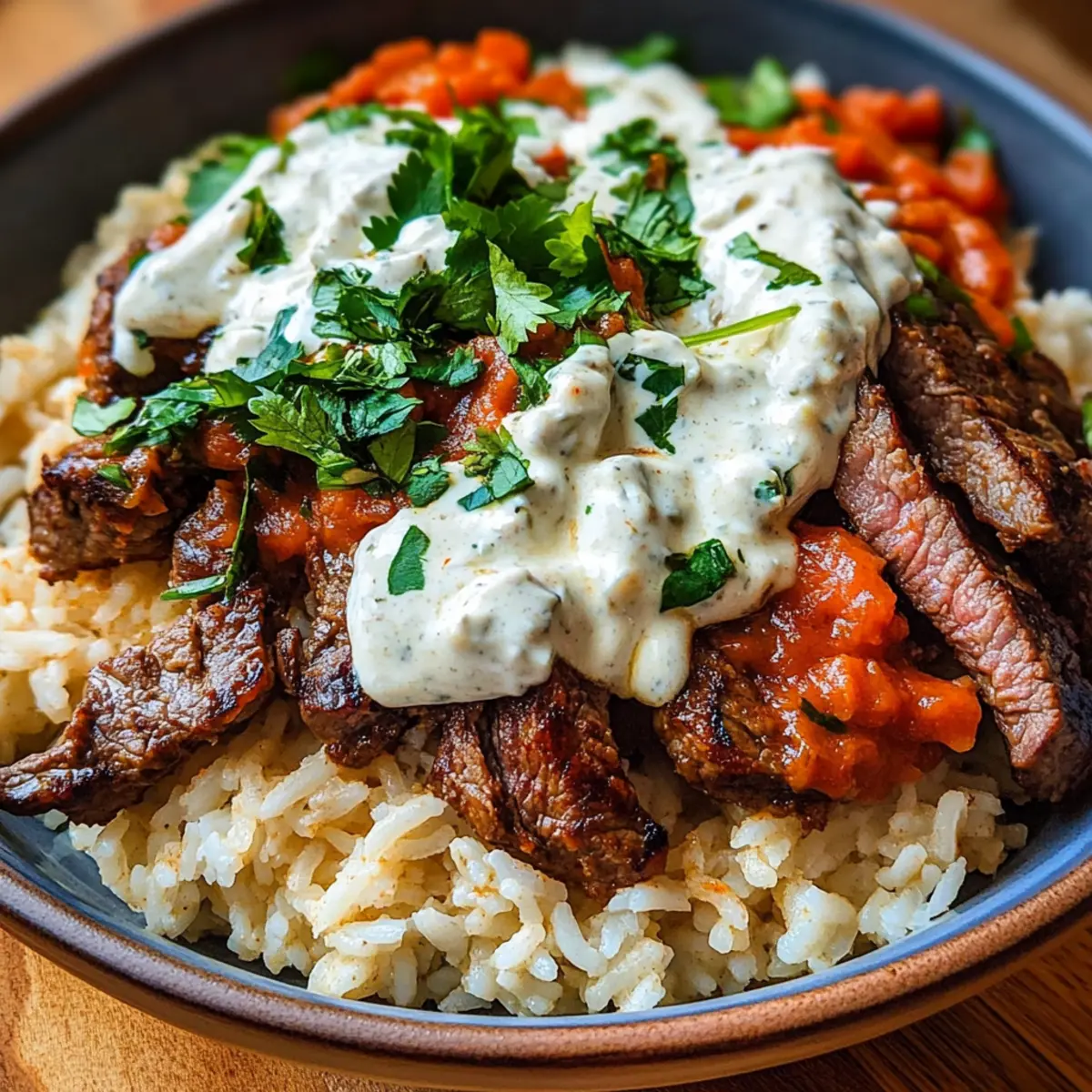 - Remove steak from the skillet, let it rest, and layer rice on a platter, sliced steak on top.