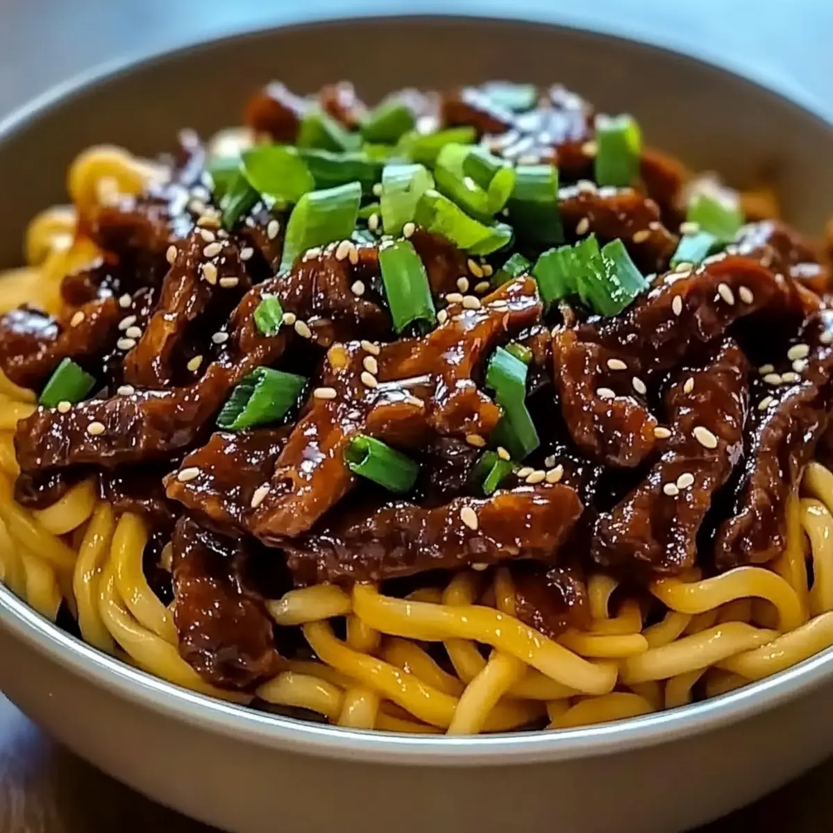 Remove the skillet from heat and transfer the Sticky Beef Noodles to serving plates. Garnish with sliced green onions and a sprinkle of sesame seeds for a pop of color and crunch. Serve immediately while hot, and enjoy the burst of flavors!
