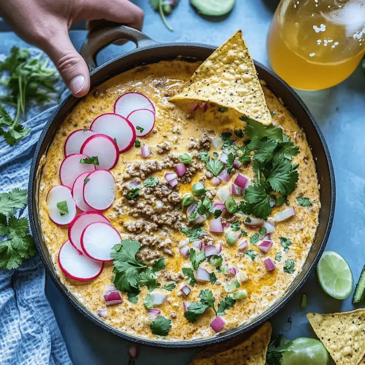 Let the dip cool for a few minutes, then generously top it with chopped cilantro, diced red onion, thinly sliced radishes, and halved cherry tomatoes for a burst of freshness. Serve warm with crispy tortilla chips for dipping, presenting a delicious appetizer that stands out at any gathering.