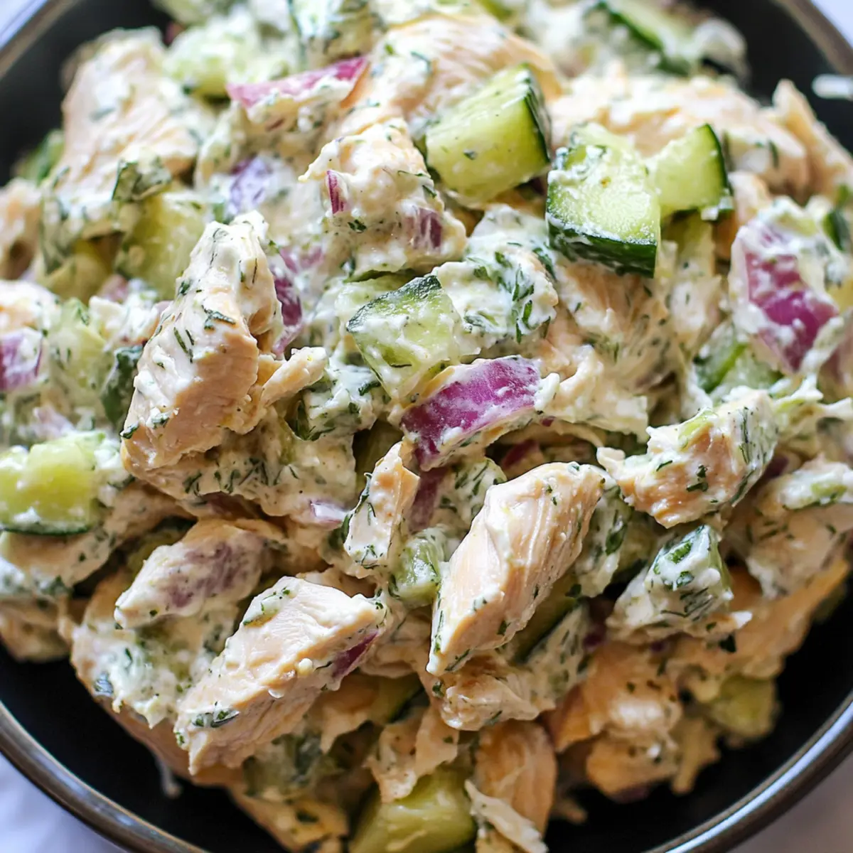 To enhance the crunch and freshness, fold in additional cucumbers, if desired. Add another ½ cup of diced cucumber (drained) and stir well to distribute. This step adds a refreshing element, making sure every spoonful of your Tzatziki Chicken Salad is bright and vibrant. Reserve some chopped herbs for garnish if you like!