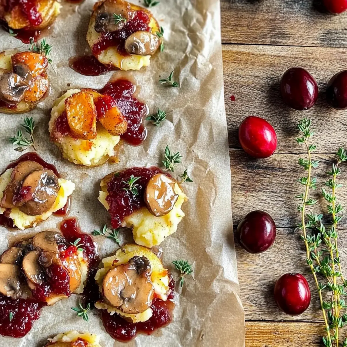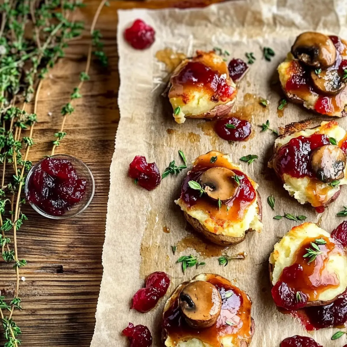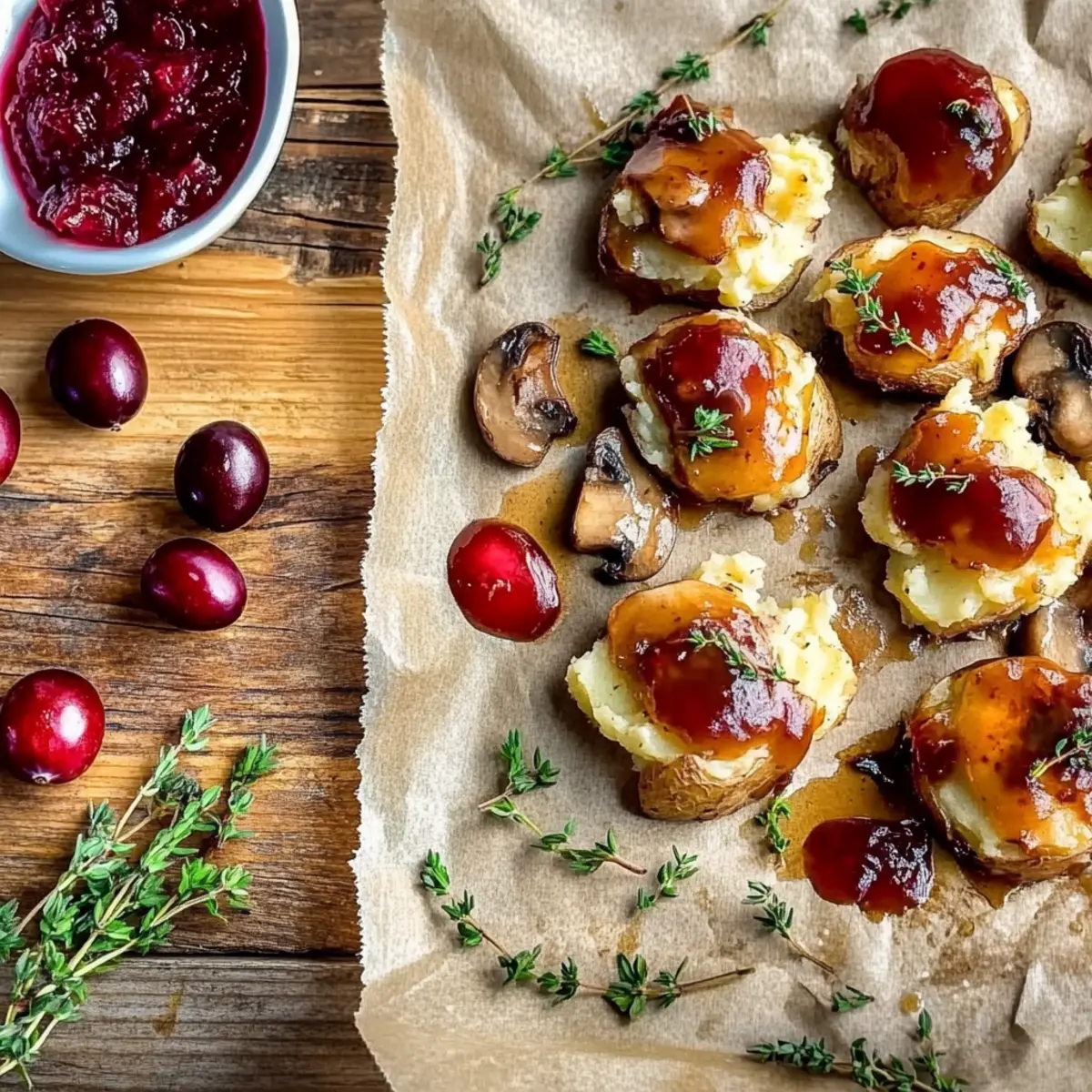 Once the potatoes are crispy and the mushroom gravy is ready, generously drizzle the warm gravy over each smashed potato. For an extra festive touch, top with cranberry sauce, a sprinkle of fresh thyme, and a crack of black pepper. Serve these delightful Vegan Thanksgiving-Style Smashed Potatoes hot, and watch as they steal the spotlight at your holiday gathering!