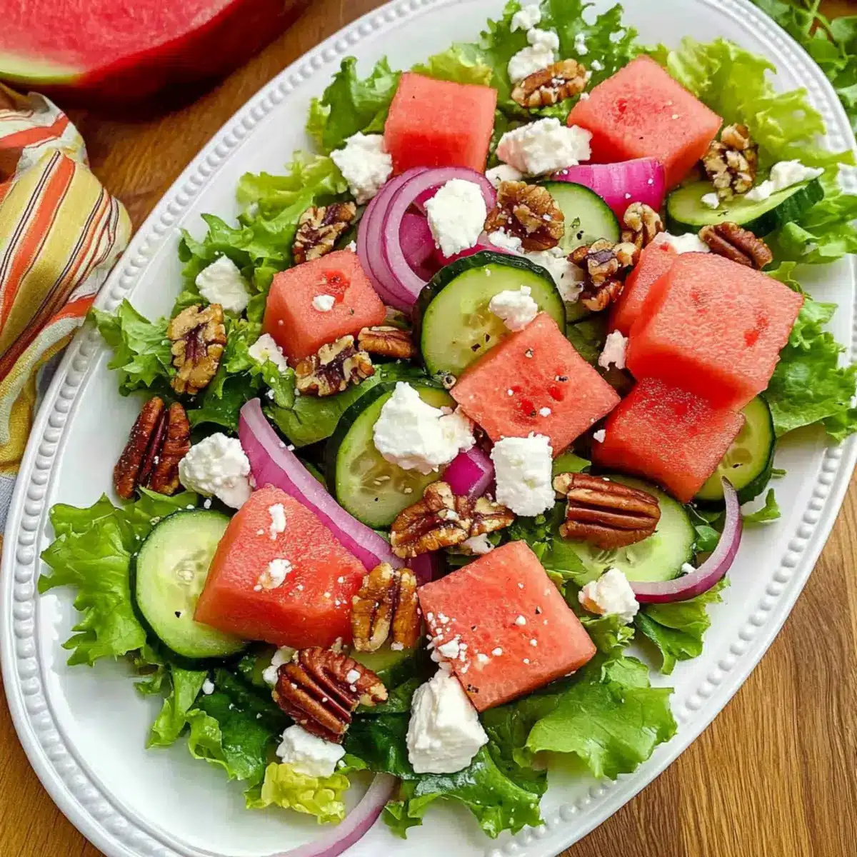This Watermelon Salad combines sweet and juicy watermelon with crisp cucumbers and tangy feta for a refreshing summer dish.
