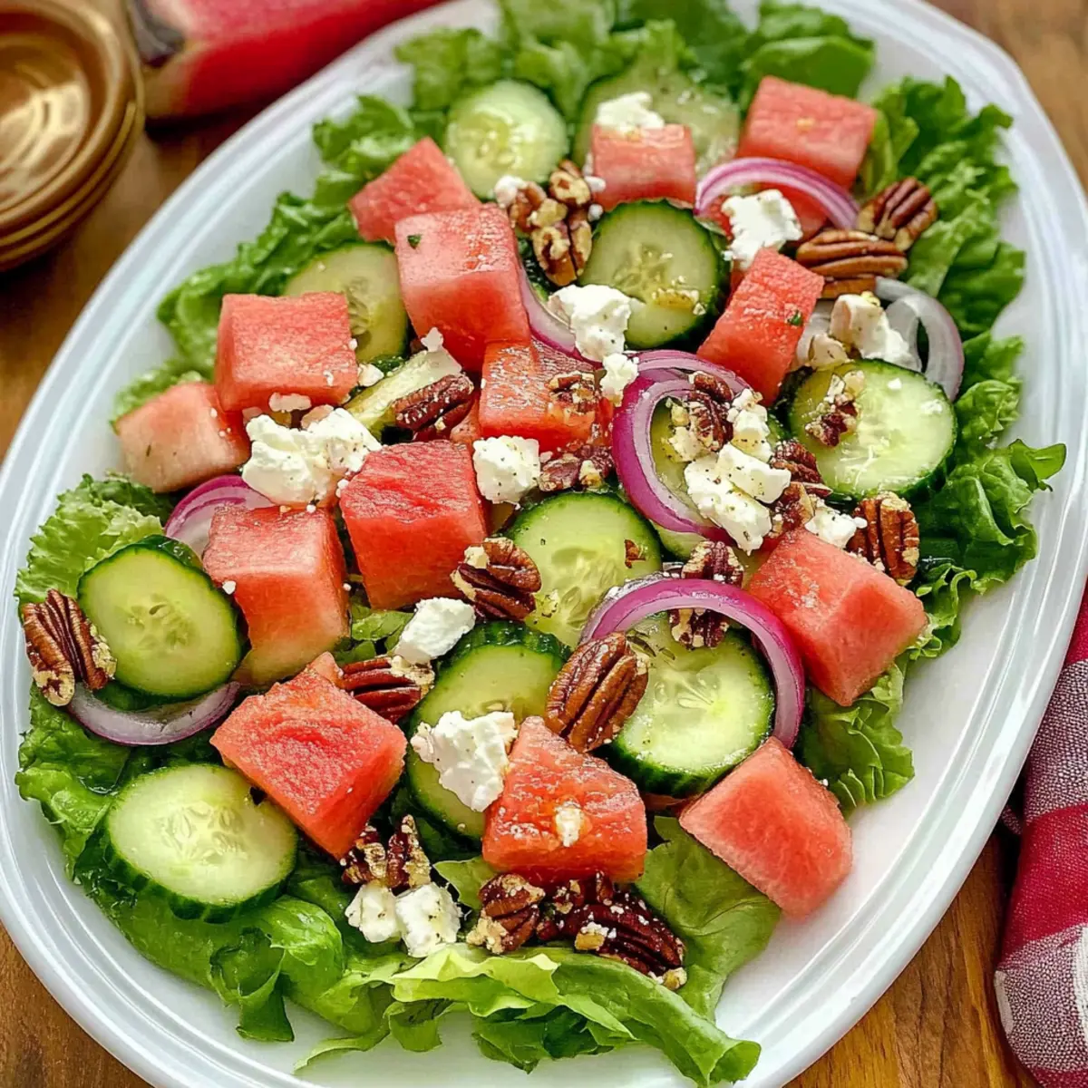 • Optimal Topping Sequence: Layer the salad in the order of heavier ingredients to lighter ones, ensuring that the watermelon and cucumbers nicely cradle the feta and pecans.